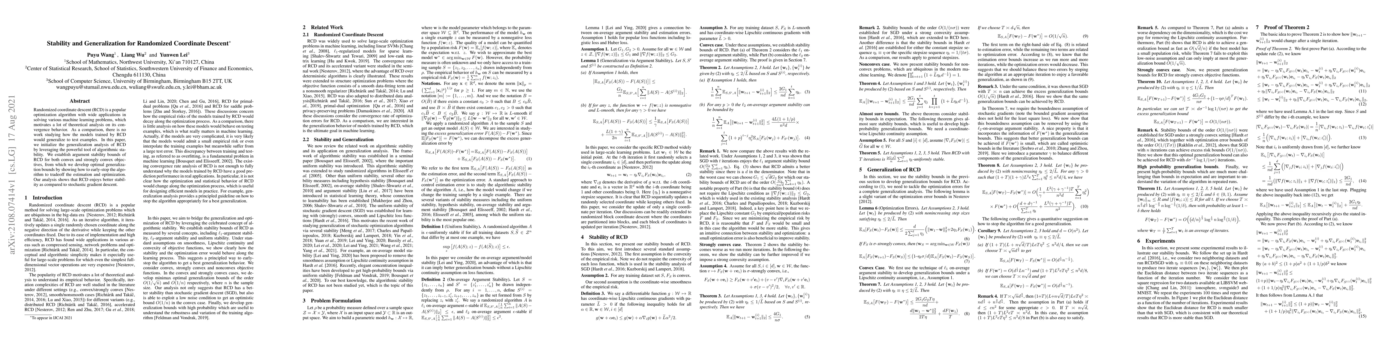 This paper initiates a study on the generalization of randomized coordinate descent (RCD) by analyzing its algorithmic stability. It establishes stability bounds for RCD under convex and strongly convex objectives, and develops optimal generalization bounds by demonstrating how early-stopping can balance estimation and optimization, showing RCD's superior stability compared to stochastic gradient descent.