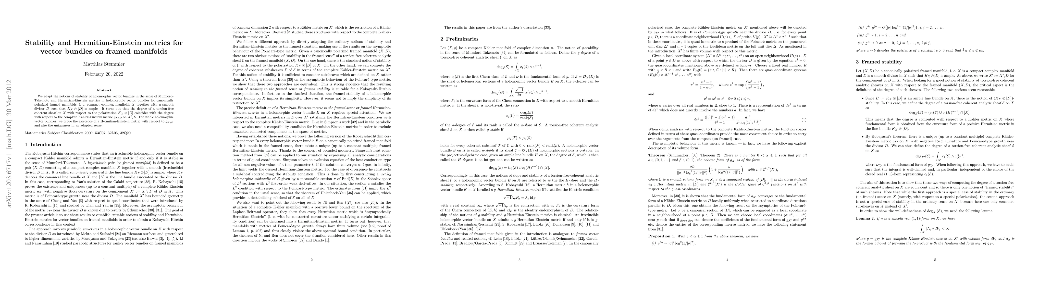 This paper extends the concepts of stability and Hermitian-Einstein metrics from holomorphic vector bundles to framed manifolds, proving the existence and uniqueness of Hermitian-Einstein metrics for stable bundles under a specific Kähler-Einstein metric. The degree of torsion-free coherent sheaves aligns with the metric on the complement of the divisor.