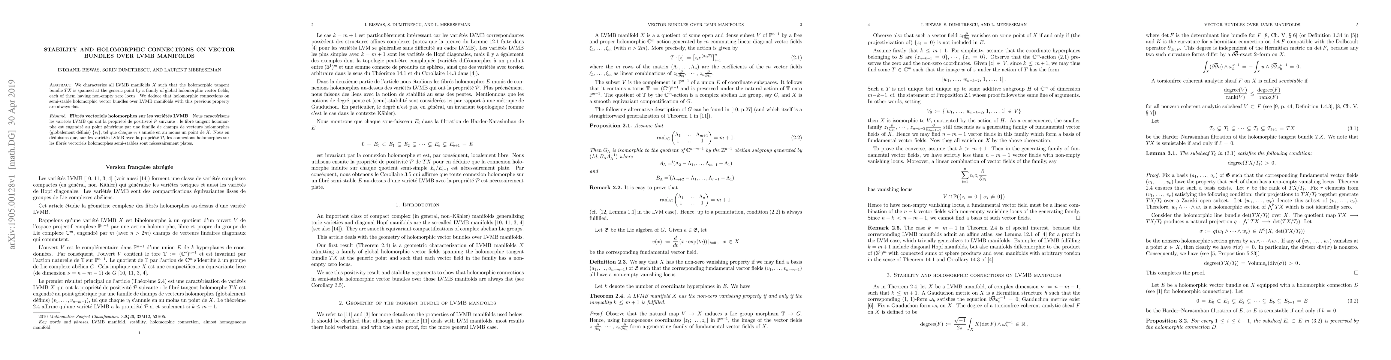 Summary: The paper characterizes LVMB manifolds where the holomorphic tangent bundle is spanned by global holomorphic vector fields with non-empty zero loci. It concludes that holomorphic connections on semi-stable vector bundles over these manifolds are flat.