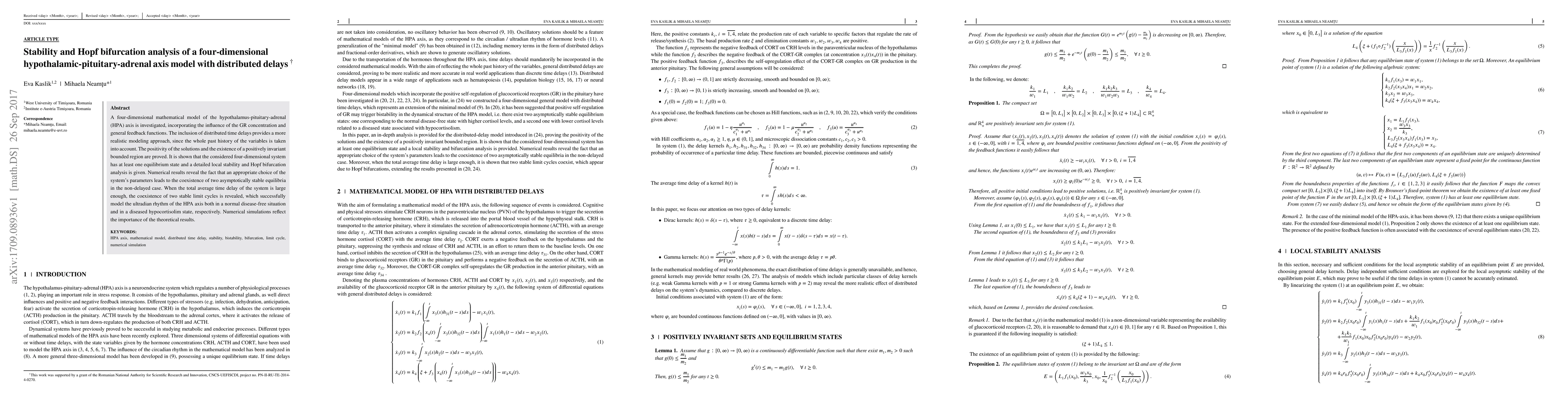 This paper investigates a four-dimensional mathematical model of the HPA axis with distributed delays, proving the positivity and boundedness of solutions. It conducts a local stability and Hopf bifurcation analysis, revealing the coexistence of stable equilibria and limit cycles under different parameter conditions.