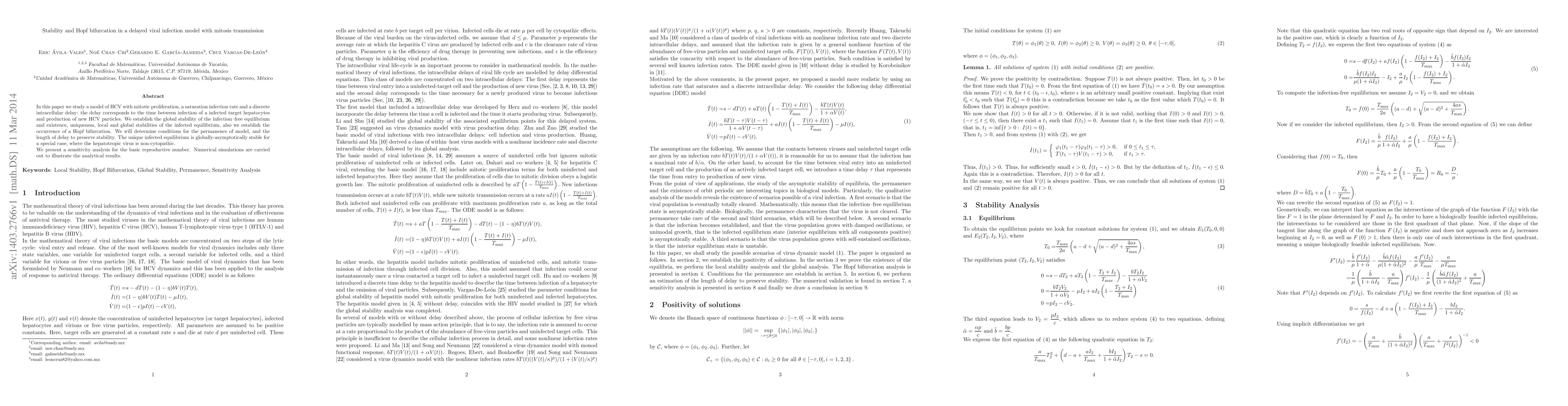 This paper investigates a viral infection model for HCV with mitotic transmission, including a discrete delay representing the time for new virus production. The study establishes global stability and explores Hopf bifurcation, determining conditions for model permanence and delay stability. Numerical simulations support the analytical findings.