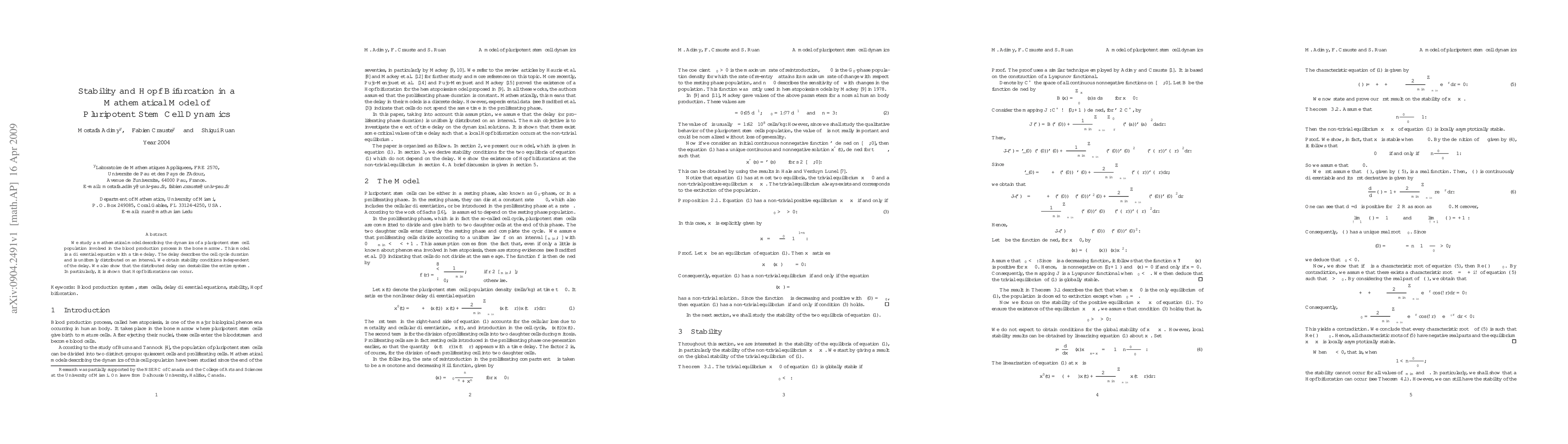 This paper investigates a differential equation model with a uniformly distributed time delay to describe pluripotent stem cell dynamics in blood production. It finds stability conditions independent of the delay and demonstrates that the delay can lead to Hopf bifurcations, destabilizing the system.