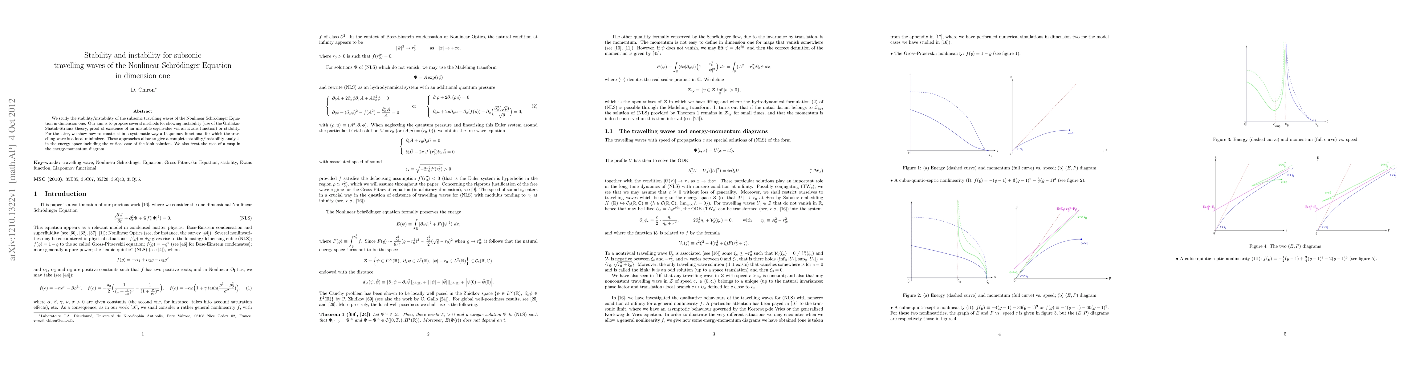 This paper investigates the stability and instability of subsonic travelling waves in the one-dimensional Nonlinear Schrödinger Equation. It employs Grillakis-Shatah-Strauss theory and Evans functions to demonstrate instability and constructs a Liapounov functional for stability analysis, providing a comprehensive stability/instability analysis in the energy space.