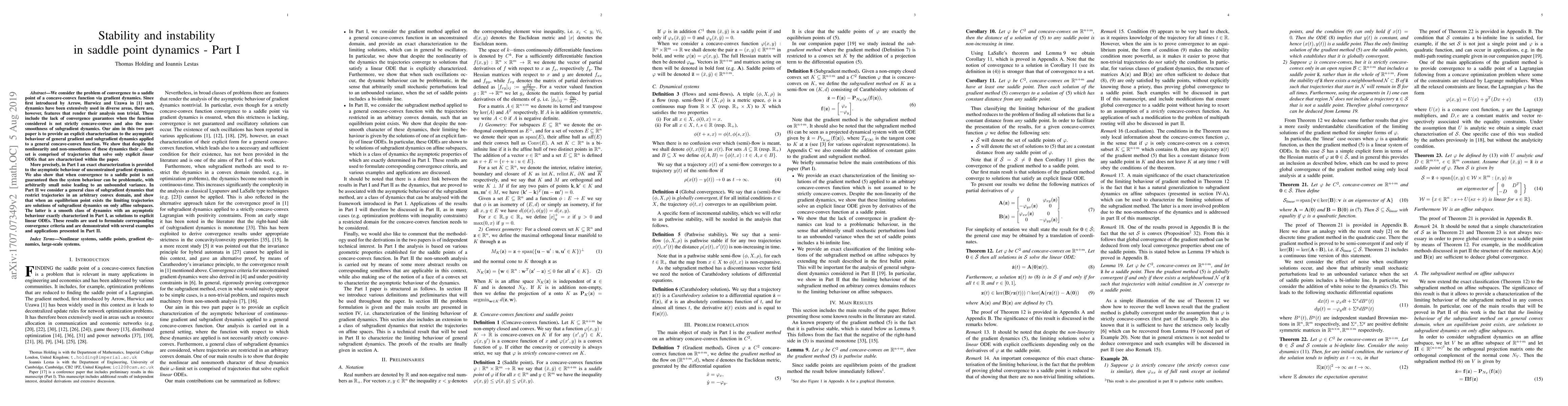 We consider the problem of convergence to a saddle point of a concave-convex function via gradient dynamics. Since first introduced by Arrow, Hurwicz and Uzawa in [1] such dynamics have been extensively used in diverse areas, there are, however, features that render their analysis non trivial. These include the lack of convergence guarantees when the function considered is not strictly concave-convex and also the non-smoothness of subgradient dynamics. Our aim in this two part paper is to provide an explicit characterization to the asymptotic behaviour of general gradient and subgradient dynamics applied to a general concave-convex function. We show that despite the nonlinearity and non-smoothness of these dynamics their $\omega$-limit set is comprised of trajectories that solve only explicit linear ODEs that are characterized within the paper. More precisely, in Part I an exact characterization is provided to the asymptotic behaviour of unconstrained gradient dynamics. We also show that when convergence to a saddle point is not guaranteed then the system behaviour can be problematic, with arbitrarily small noise leading to an unbounded variance. In Part II we consider a general class of subgradient dynamics that restrict trajectories in an arbitrary convex domain, and show that when an equilibrium point exists their limiting trajectories are solutions of subgradient dynamics on only affine subspaces. The latter is a smooth class of dynamics with an asymptotic behaviour exactly characterized in Part I, as solutions to explicit linear ODEs. These results are used to formulate corresponding convergence criteria and are demonstrated with several examples and applications presented in Part II.