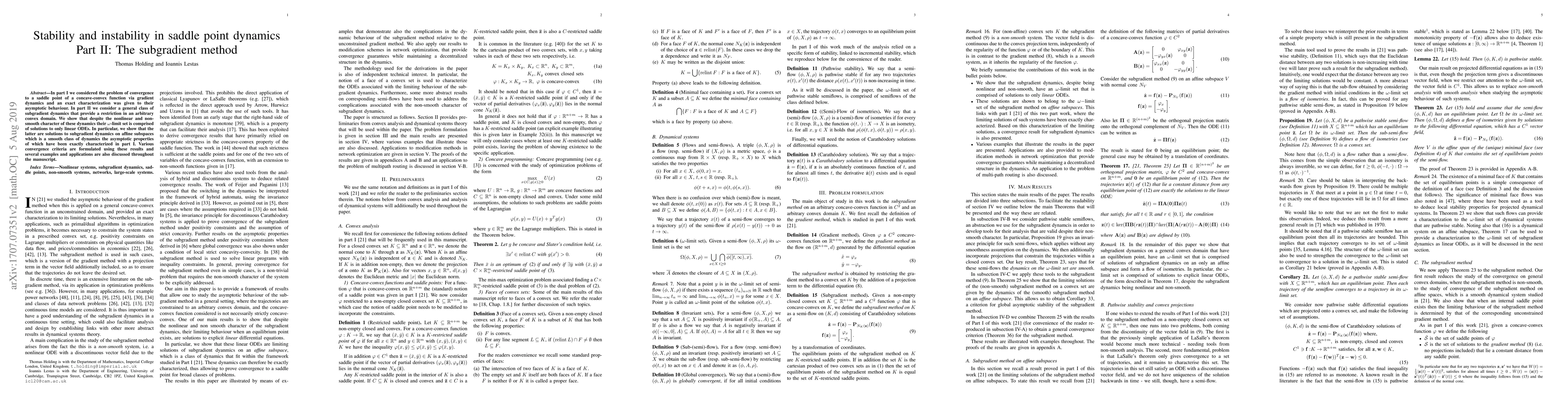 In part I we considered the problem of convergence to a saddle point of a concave-convex function via gradient dynamics and an exact characterization was given to their asymptotic behaviour. In part II we consider a general class of subgradient dynamics that provide a restriction in an arbitrary convex domain. We show that despite the nonlinear and non-smooth character of these dynamics their $\omega$-limit set is comprised of solutions to only linear ODEs. In particular, we show that the latter are solutions to subgradient dynamics on affine subspaces which is a smooth class of dynamics the asymptotic properties of which have been exactly characterized in part I. Various convergence criteria are formulated using these results and several examples and applications are also discussed throughout the manuscript.