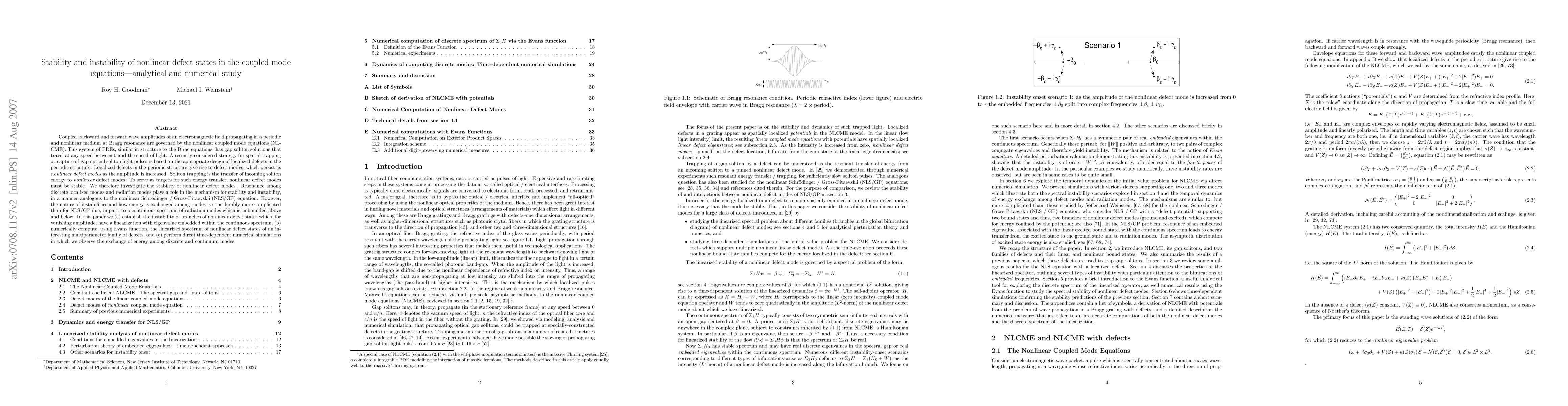 Coupled backward and forward wave amplitudes of an electromagnetic field propagating in a periodic and nonlinear medium at Bragg resonance are governed by the nonlinear coupled mode equations (NLCME). This system of PDEs, similar in structure to the Dirac equations, has gap soliton solutions that travel at any speed between 0 and the speed of light. A recently considered strategy for spatial trapping or capture of gap optical soliton light pulses is based on the appropriate design of localized defects in the periodic structure. Localized defects in the periodic structure give rise to defect modes, which persist as {\it nonlinear defect modes} as the amplitude is increased. Soliton trapping is the transfer of incoming soliton energy to {\it nonlinear} defect modes. To serve as targets for such energy transfer, nonlinear defect modes must be stable. We therefore investigate the stability of nonlinear defect modes. Resonance among discrete localized modes and radiation modes plays a role in the mechanism for stability and instability, in a manner analogous to the nonlinear Schr\"odinger / Gross-Pitaevskii (NLS/GP) equation. However, the nature of instabilities and how energy is exchanged among modes is considerably more complicated than for NLS/GP due, in part, to a continuous spectrum of radiation modes which is unbounded above and below. In this paper we (a) establish the instability of branches of nonlinear defect states which, for vanishing amplitude, have a linearization with eigenvalue embedded within the continuous spectrum, (b) numerically compute, using Evans function, the linearized spectrum of nonlinear defect states of an interesting multiparameter family of defects, and (c) perform direct time-dependent numerical simulations in which we observe the exchange of energy among discrete and continuum modes.
