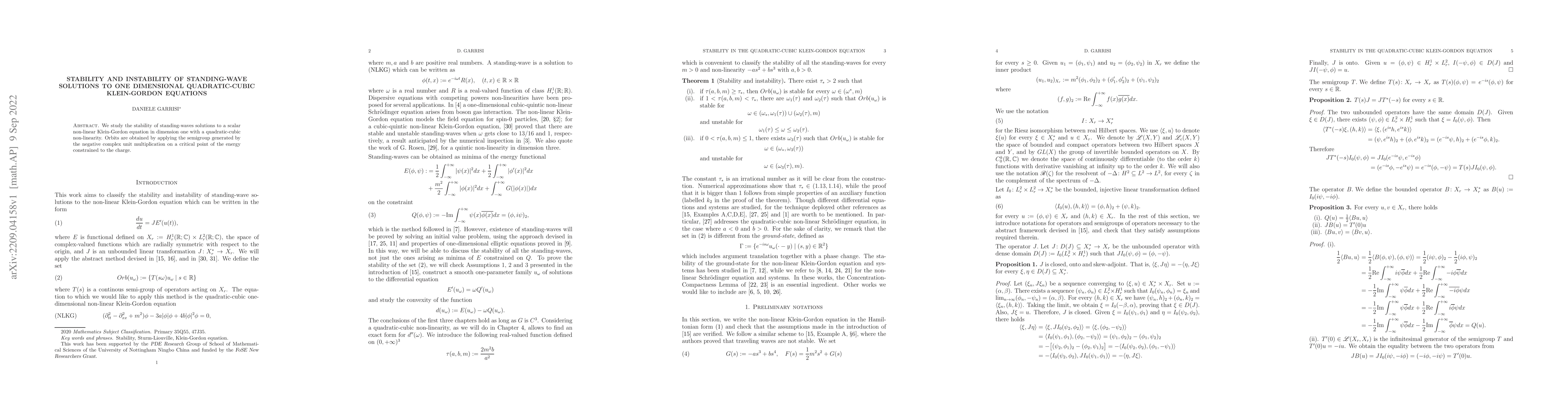 Summary: This paper investigates the stability of standing-wave solutions to a one-dimensional Klein-Gordon equation featuring quadratic-cubic non-linearity, utilizing a semigroup approach to analyze orbits constrained by energy and charge. The study reveals the conditions under which these solutions remain stable.