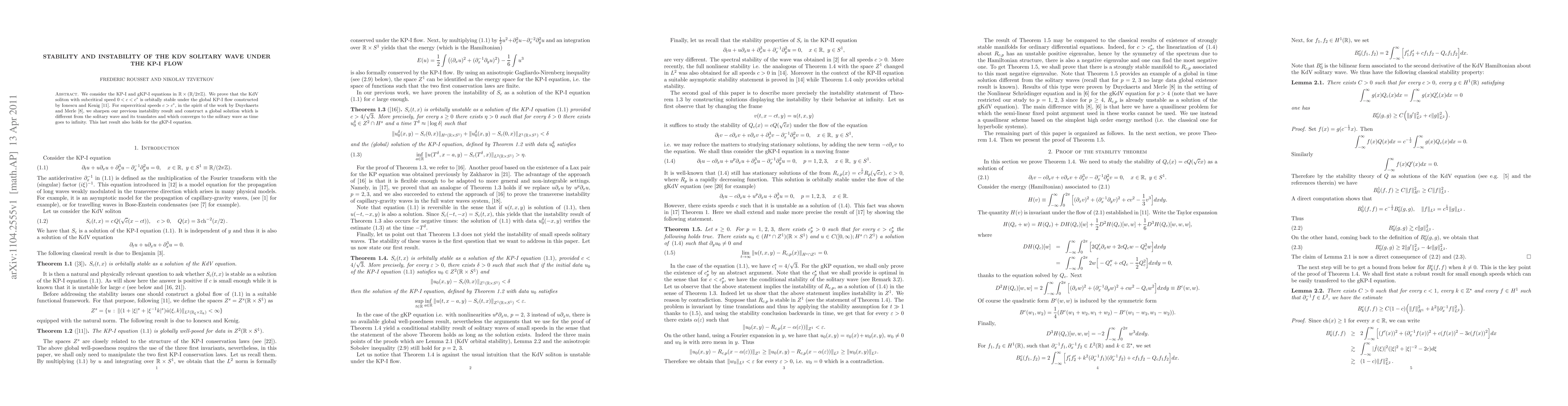 This paper investigates the stability of KdV solitary waves under the KP-I flow, proving orbital stability for subcritical speeds and constructing a solution that diverges from the solitary wave for supercritical speeds, thus confirming instability. The findings also extend to the gKP-I equation.