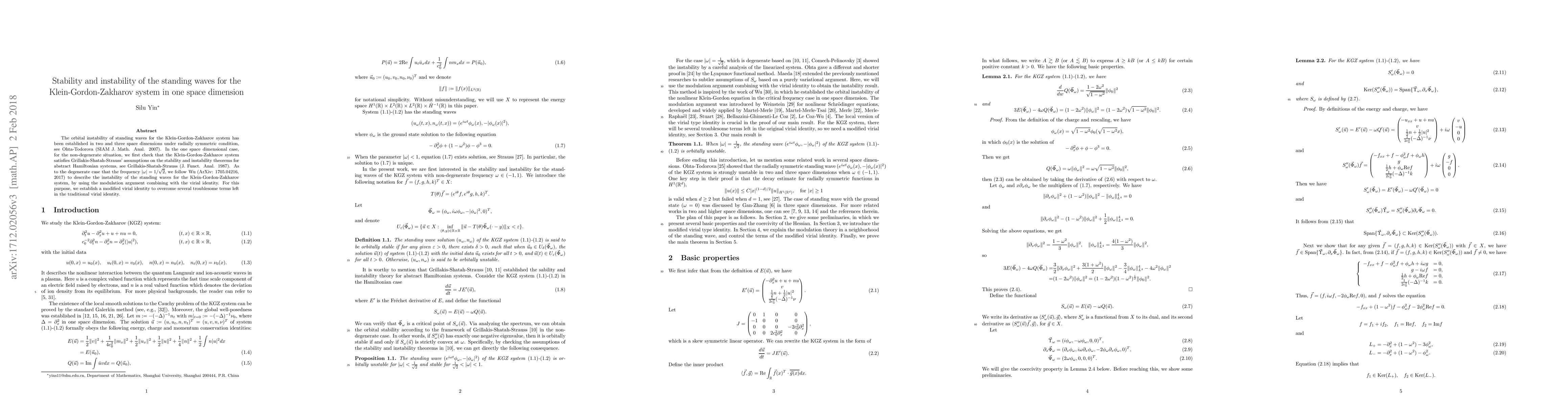 This paper investigates the stability and instability of standing waves for the Klein-Gordon-Zakharov system in one space dimension. It confirms the system's compliance with stability theorems for Hamiltonian systems and describes the instability of standing waves in both non-degenerate and degenerate cases using modulation arguments and a modified virial identity.