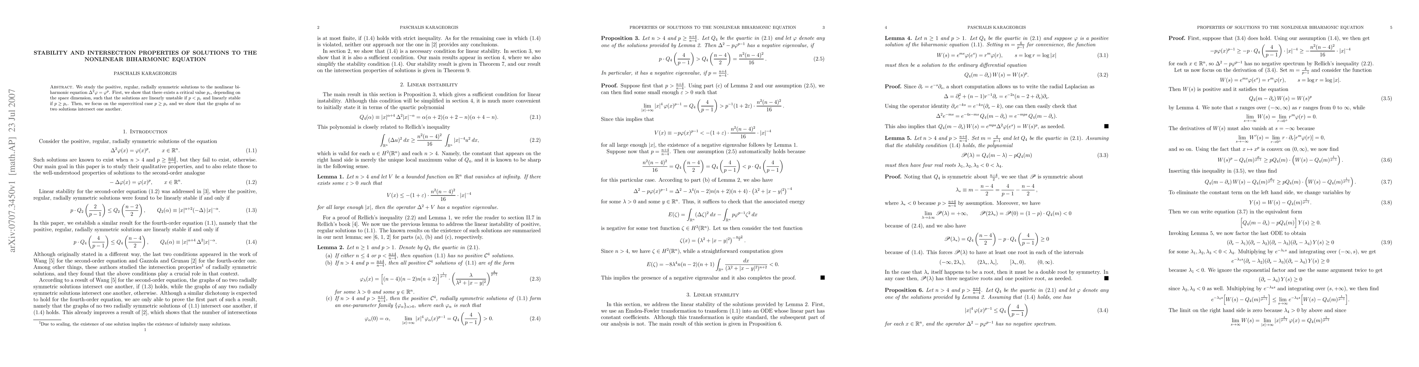 This paper investigates the stability and intersection properties of radially symmetric solutions to the nonlinear biharmonic equation $\Delta^2 \phi = \phi^p$. It finds a critical value $p_c$ where solutions switch from unstable to stable, and proves that in the supercritical case, no two solution graphs intersect.