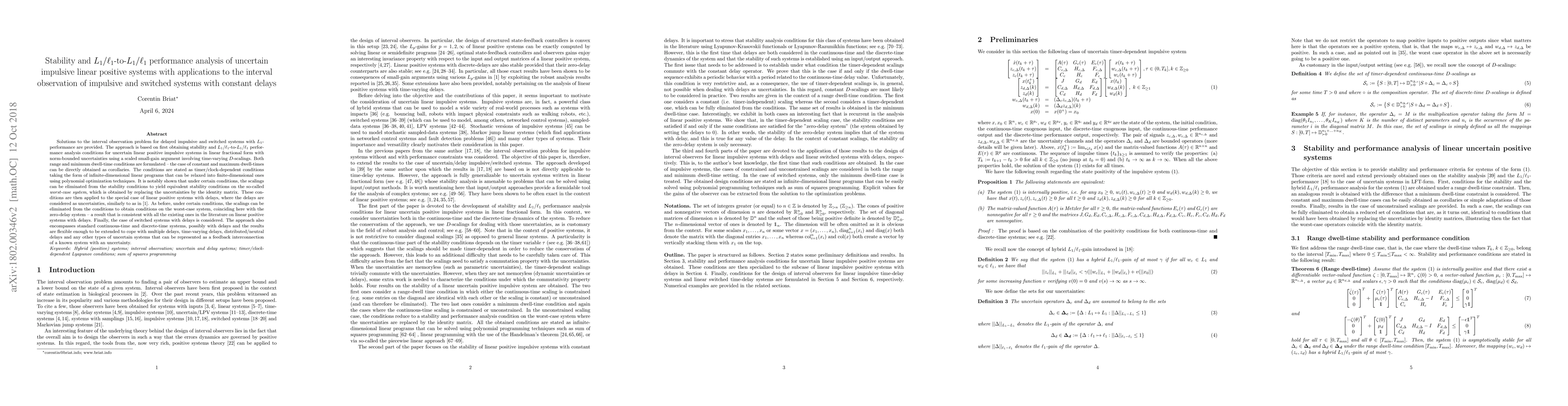 Solutions to the interval observation problem for delayed impulsive and switched systems with $L_1$-performance are provided. The approach is based on first obtaining stability and $L_1/\ell_1$-to-$L_1/\ell_1$ performance analysis conditions for uncertain linear positive impulsive systems in linear fractional form with norm-bounded uncertainties using a scaled small-gain argument involving time-varying $D$-scalings. Both range and minimum dwell-time conditions are formulated -- the case of constant and maximum dwell-times can be directly obtained as corollaries. The conditions are stated as timer/clock-dependent conditions taking the form of infinite-dimensional linear programs that can be relaxed into finite-dimensional ones using polynomial optimization techniques. It is notably shown that under certain conditions, the scalings can be eliminated from the stability conditions to yield equivalent stability conditions on the so-called "worst-case system", which is obtained by replacing the uncertainties by the identity matrix. These conditions are then applied to the special case of linear positive systems with delays, where the delays are considered as uncertainties. As before, under certain conditions, the scalings can be eliminated from the conditions to obtain conditions on the worst-case system, coinciding here with the zero-delay system -- a result that is consistent with all the existing ones in the literature on linear positive systems with delays. Finally, the case of switched systems with delays is considered. The approach also encompasses standard continuous-time and discrete-time systems, possibly with delays and the results are flexible enough to be extended to cope with multiple delays, time-varying delays, distributed/neutral delays and any other types of uncertain systems that can be represented as a feedback interconnection of a known system with an uncertainty.