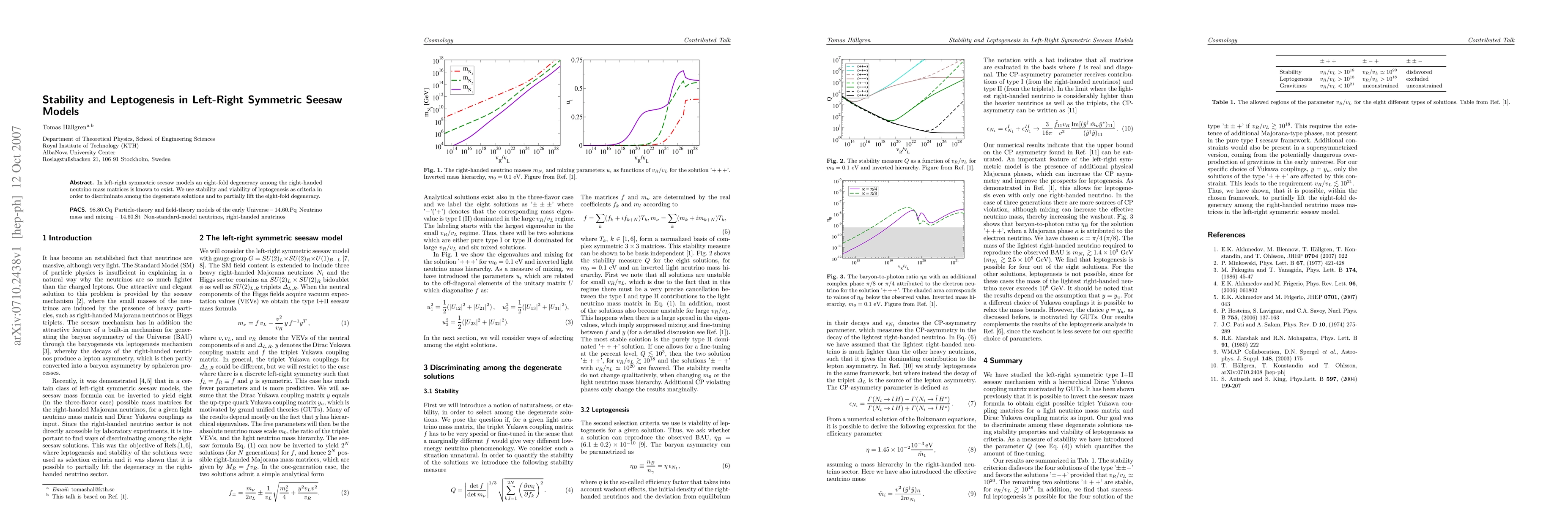 This research explores stability and viability of leptogenesis in left-right symmetric seesaw models to distinguish among the eight possible degenerate solutions, partially resolving the eight-fold degeneracy in right-handed neutrino mass matrices.