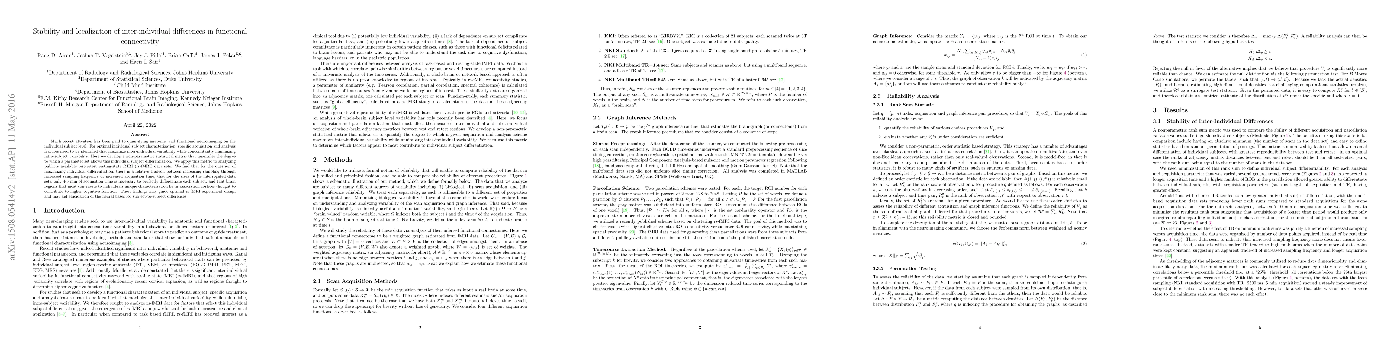 Much recent attention has been paid to quantifying anatomic and functional neuroimaging on the individual subject level. For optimal individual subject characterization, specific acquisition and analysis features need to be identified that maximize inter-individual variability while concomitantly minimizing intra-subject variability. Here we develop a non-parametric statistical metric that quantifies the degree to which a parameter set allows this individual subject differentiation. We apply this metric to analyzing publicly available test-retest resting-state fMRI (rs-fMRI) data sets. We find that for the question of maximizing individual differentiation, there is a relative tradeoff between increasing sampling through increased sampling frequency or increased acquisition time; that for the sizes of the interrogated data sets, only 4-5 min of acquisition time is necessary to perfectly differentiate each subject; and that brain regions that most contribute to individuals unique characterization lie in association cortices thought to contribute to higher cognitive function. These findings may guide optimal rs-fMRI experiment design and may aid elucidation of the neural bases for subject-to-subject differences.