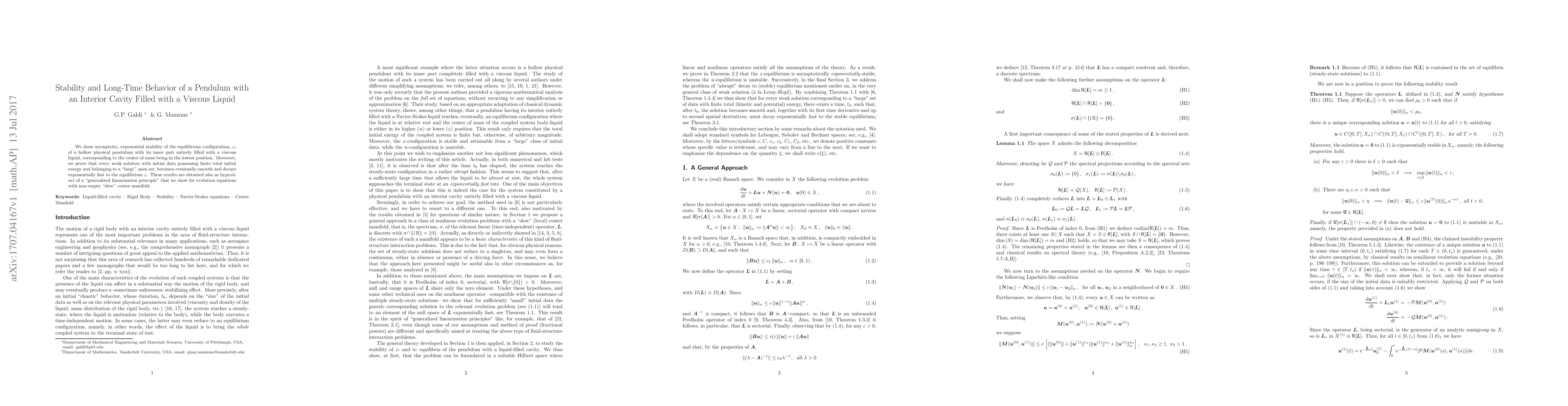 This paper demonstrates the asymptotic, exponential stability of a pendulum filled with viscous liquid, showing that it eventually smooths out and decays to its equilibrium position. The results are derived using a generalized linearization principle for evolution equations with a non-empty slow center manifold.