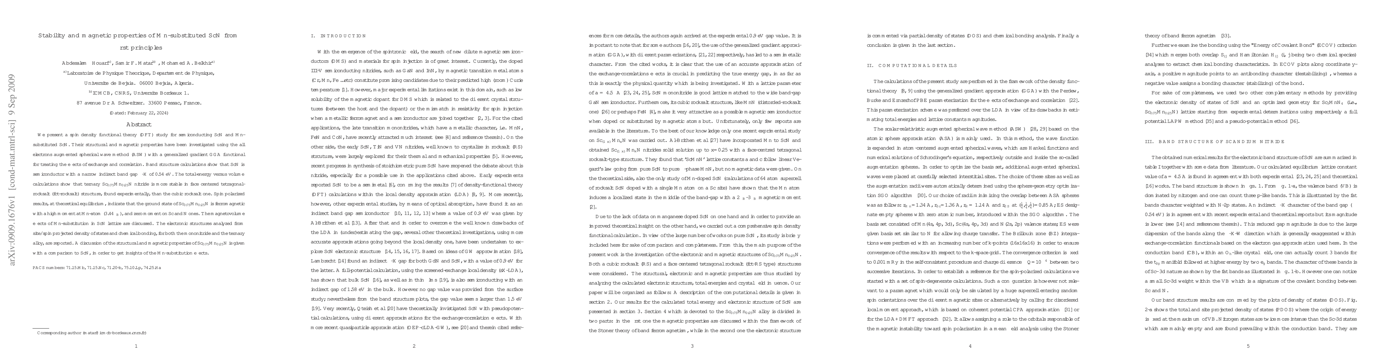 We present a spin density functional theory (DFT) study for semiconducting ScN and Mn-substituted ScN. Their structural and magnetic properties have been investigated using the all electrons augmented spherical wave method (ASW) with a generalized gradient GGA functional for treating the effects of exchange and correlation. Band structure calculations show that ScN is semiconductor with a narrow indirect band gap $\Gamma$-X of 0.54 eV. The total-energy versus volume calculations show that ternary Sc$_{0.75}$Mn$_{0.25}$N nitride is more stable in face centered tetragonal-rocksalt (fct-rocksalt) structure, found experimentally, than the cubic rocksalt one. Spin polarized results, at theoretical equilibrium, indicate that the ground state of Sc$_{0.75}$Mn$_{0.25}$N is ferromagnetic with a high moment at Mn-atom (3.44$\mu_B$), and zero moment on Sc and N ones. The magnetovolume effects of Mn-substitution in ScN lattice are discussed. The electronic structures analyzed from site/spin projected density of states and chemical bonding, for both the mononitride and the ternary alloy, are reported. A discussion of the structural and magnetic properties of Sc$_{0.75}$Mn$_{0.25}$N is given with a comparison to ScN, in order to get insights of the Mn-substitution effects.