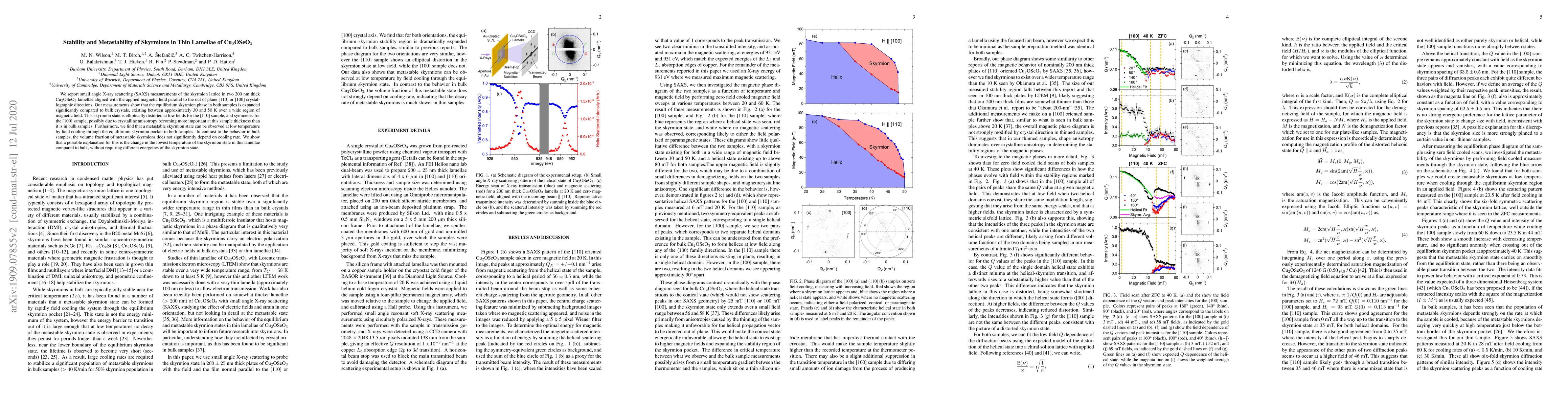 We report small angle X-ray scattering (SAXS) measurements of the skyrmion lattice in two 200~nm thick Cu$_2$OSeO$_3$ lamellae aligned with the applied magnetic field parallel to the out of plane [110] or [100] crystallographic directions. Our measurements show that the equilibrium skyrmion phase in both samples is expanded significantly compared to bulk crystals, existing between approximately 30 and 50~K over a wide region of magnetic field. This skyrmion state is elliptically distorted at low fields for the [110] sample, and symmetric for the [100] sample, possibly due to crystalline anisotropy becoming more important at this sample thickness than it is in bulk samples. Furthermore, we find that a metastable skyrmion state can be observed at low temperature by field cooling through the equilibrium skyrmion pocket in both samples. In contrast to the behavior in bulk samples, the volume fraction of metastable skyrmions does not significantly depend on cooling rate. We show that a possible explanation for this is the change in the lowest temperature of the skyrmion state in this lamellae compared to bulk, without requiring different energetics of the skyrmion state.