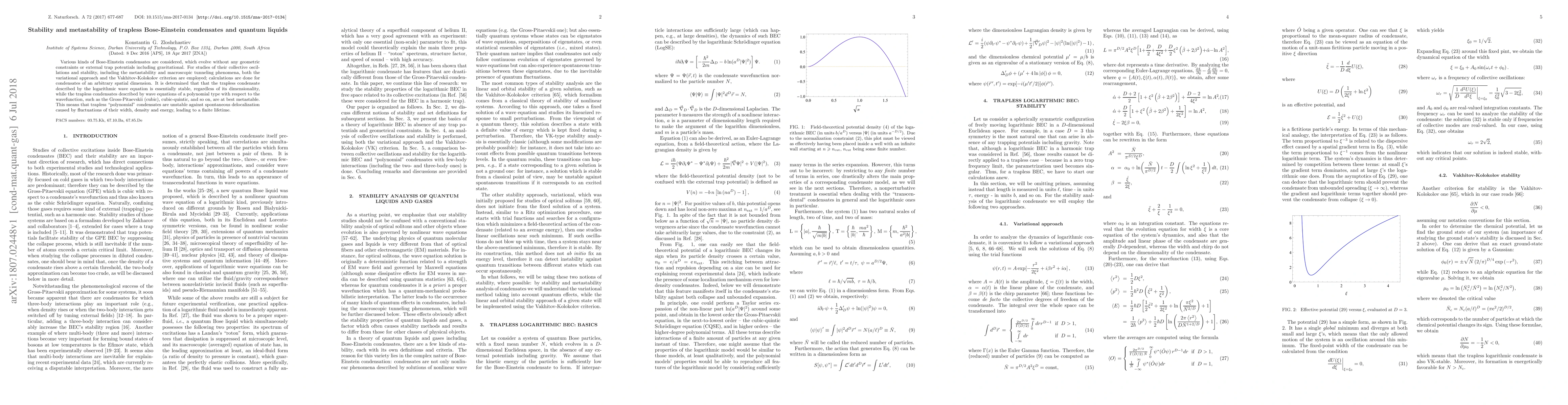Various kinds of Bose-Einstein condensates are considered, which evolve without any geometric constraints or external trap potentials including gravitational. For studies of their collective oscillations and stability, including the metastability and macroscopic tunneling phenomena, both the variational approach and the Vakhitov-Kolokolov criterion are employed, calculations are done for condensates of an arbitrary spatial dimension. It is determined that that the trapless condensate described by the logarithmic wave equation is essentially stable, regardless of its dimensionality, while the trapless condensates described by wave equations of a polynomial type with respect to the wavefunction, such as the Gross-Pitaevskii (cubic), cubic-quintic, and so on, are at best metastable. This means that trapless "polynomial" condensates are unstable against spontaneous delocalization caused by fluctuations of their width, density and energy, leading to a finite lifetime.
