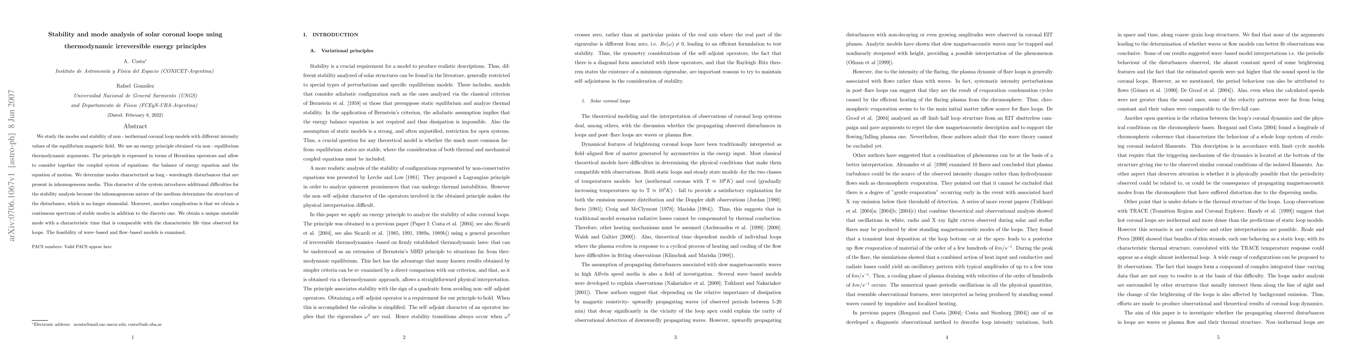 We study the modes and stability of non - isothermal coronal loop models with different intensity values of the equilibrium magnetic field. We use an energy principle obtained via non - equilibrium thermodynamic arguments. The principle is expressed in terms of Hermitian operators and allow to consider together the coupled system of equations: the balance of energy equation and the equation of motion. We determine modes characterized as long - wavelength disturbances that are present in inhomogeneous media. This character of the system introduces additional difficulties for the stability analysis because the inhomogeneous nature of the medium determines the structure of the disturbance, which is no longer sinusoidal. Moreover, another complication is that we obtain a continuous spectrum of stable modes in addition to the discrete one. We obtain a unique unstable mode with a characteristic time that is comparable with the characteristic life-time observed for loops. The feasibility of wave-based and flow-based models is examined.