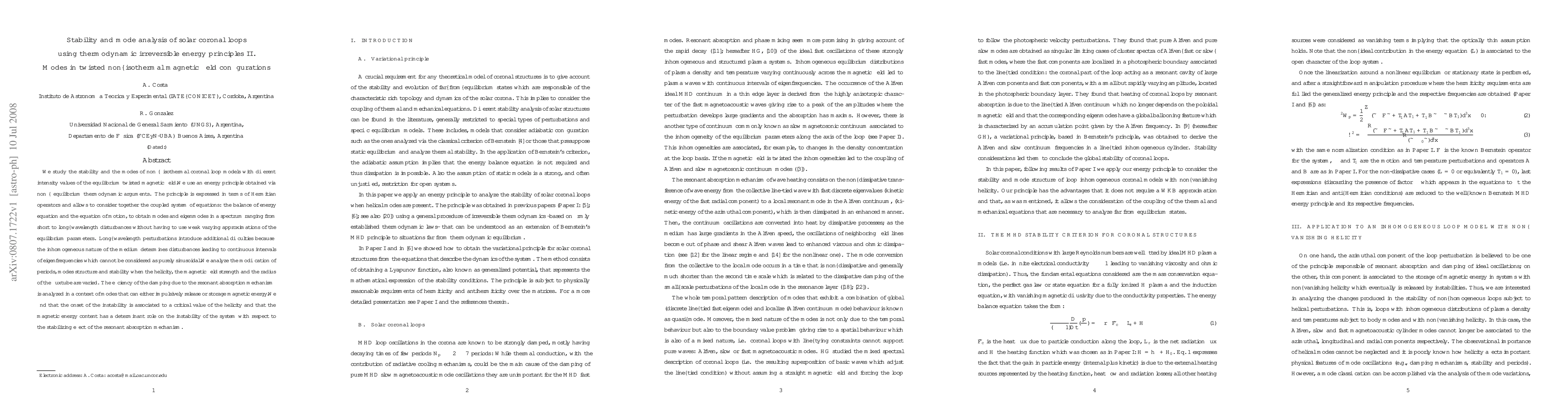 We study the stability and the modes of non -- isothermal coronal loop models with different intensity values of the equilibrium twisted magnetic field.We use an energy principle obtained via non -- equilibrium thermodynamic arguments. The principle is expressed in terms of Hermitian operators and allows to consider together the coupled system of equations: the balance of energy equation and the equation of motion, to obtain modes and eigenmodes in a spectrum ranging from short to long--wavelength disturbances without having to use weak varying approximations of the equilibrium parameters. Long--wavelength perturbations introduce additional difficulties because the inhomogeneous nature of the medium determines disturbances leading to continuous intervals of eigenfrequencies which cannot be considered as purely sinusoidal.We analyze the modification of periods, modes structure and stability when the helicity, the magnetic field strength and the radius of the fluxtube are varied. The efficiency of the damping due to the resonant absorption mechanism is analyzed in a context of modes that can either impulsively release or storage magnetic energy.We find that the onset of the instability is associated to a critical value of the helicity and that the magnetic energy content has a determinant role on the instability of the system with respect to the stabilizing effect of the resonant absorption mechanism.