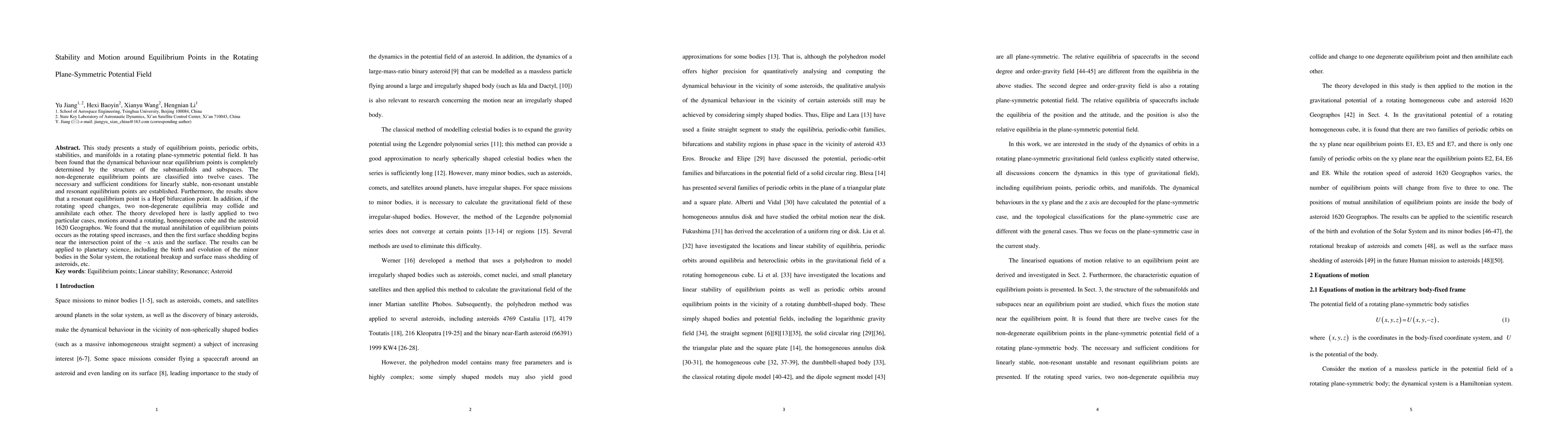 This paper investigates the stability and motion around equilibrium points in a rotating plane-symmetric potential field, classifying non-degenerate points into twelve cases and establishing conditions for stability. It finds that equilibrium points can annihilate each other with changes in rotation speed, with applications to planetary science and the evolution of minor bodies.