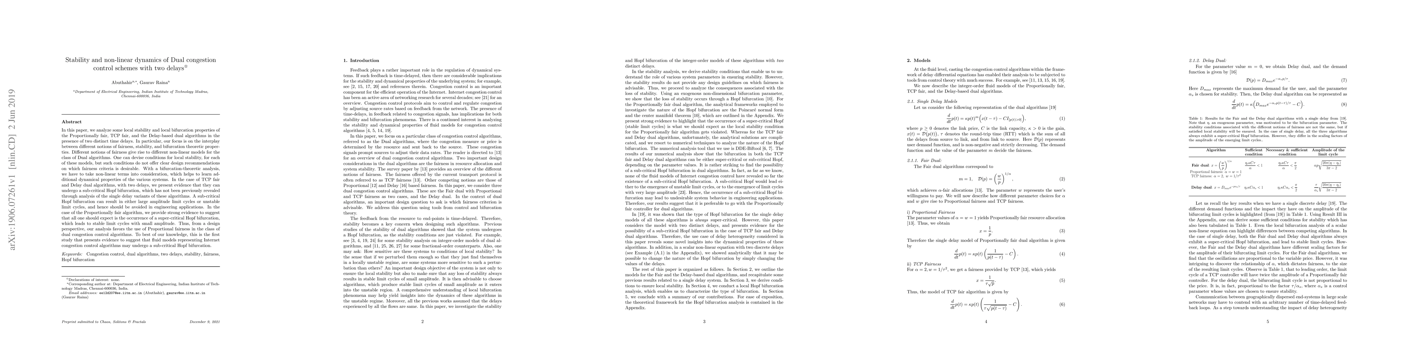 This paper analyzes the stability and bifurcation properties of three dual congestion control algorithms—Proportionally fair, TCP fair, and Delay-based—under two distinct time delays. It reveals that TCP fair and Delay dual algorithms may undergo sub-critical Hopf bifurcations, potentially leading to undesirable large or unstable limit cycles, while Proportionally fair favors stable, small amplitude limit cycles, suggesting its preference in design.