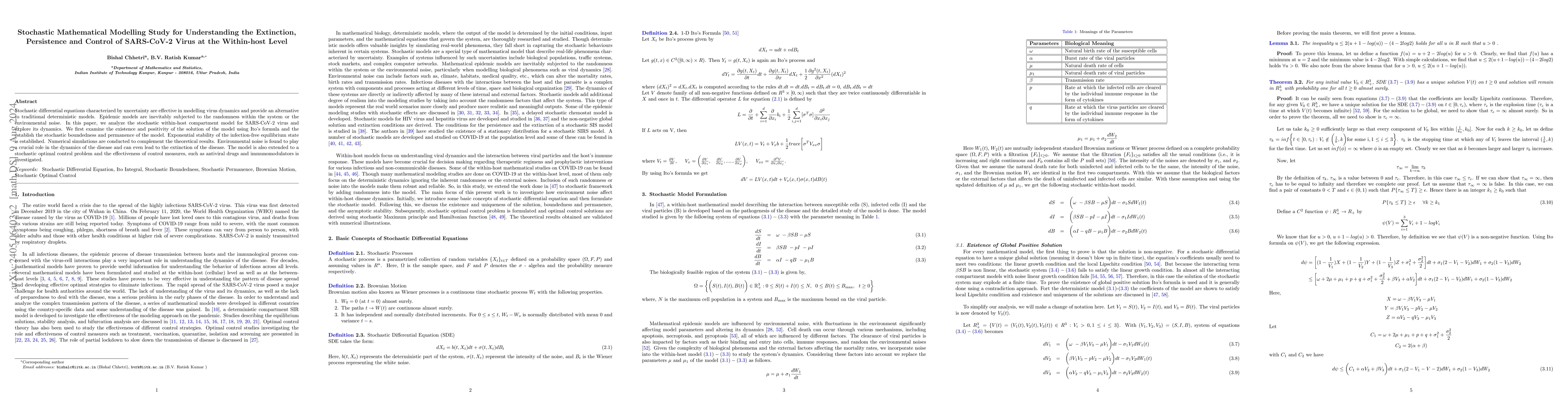 In this paper, we analyze the stochastic SIV model for COVID-19 at the within-host level and explore its dynamics. We first examine the existence and positivity of the solution of the stochastic model using Ito's formula and establish exponential stability. Next, we extend the model to a stochastic optimal control problem and investigate the effectiveness of control measures, specifically antiviral drugs and immunomodulators. Numerical simulations are conducted to complement the theoretical results in both cases. Simulation suggests that the noises play a crucial role in the dynamics of the disease and disease can be eradicated with appropriate values of the stochastic coefficient. Stochastic optimal control study suggests that the viral load count in an infected individual decreases with the optimal treatment rates and is most effective when the antiviral and immunomodulating drugs are administered together.