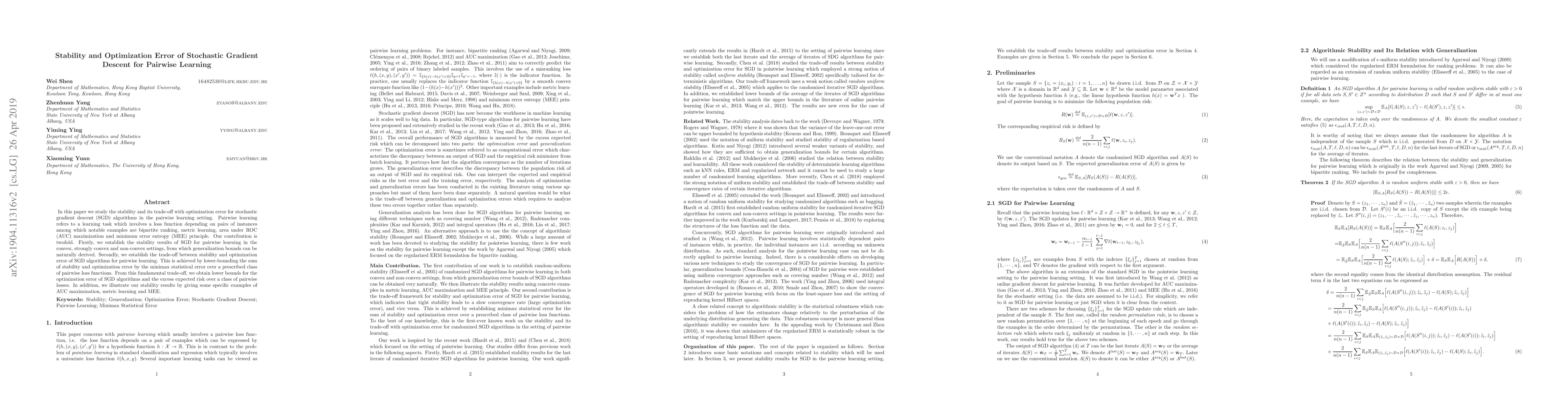 This paper investigates the stability and optimization error trade-off of stochastic gradient descent (SGD) in pairwise learning tasks, establishing stability results across convex, strongly convex, and non-convex settings. The authors also demonstrate a fundamental trade-off between stability and optimization error, providing lower bounds for SGD's performance in various pairwise learning scenarios.