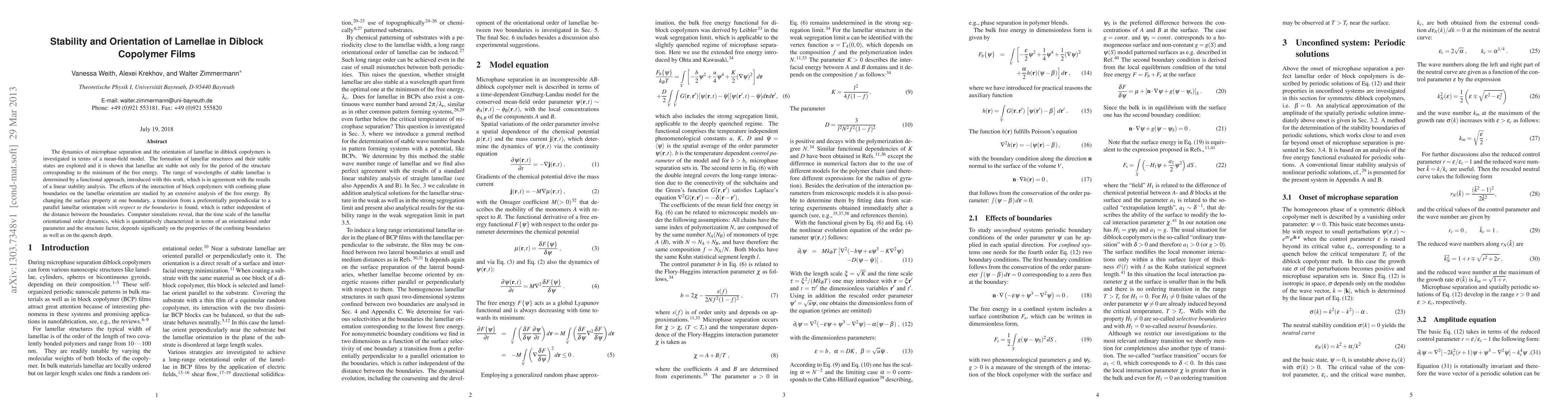 The dynamics of microphase separation and the orientation of lamellae in diblock copolymers is investigated in terms of a mean-field model. The formation of lamellar structures and their stable states are explored and it is shown that lamellae are stable not only for the period of the structure corresponding to the minimum of the free energy. The range of wavelengths of stable lamellae is determined by a functional approach, introduced with this work, which is in agreement with the results of a linear stability analysis. The effects of the interaction of block copolymers with confining plane boundaries on the lamellae orientation are studied by an extensive analysis of the free energy. By changing the surface property at one boundary, a transition from a preferentially perpendicular to a parallel lamellar orientation with respect to the boundaries is found, which is rather independent of the distance between the boundaries. Computer simulations reveal, that the time scale of the lamellar orientational order dynamics, which is quantitatively characterized in terms of an orientational order parameter and the structure factor, depends significantly on the properties of the confining boundaries as well as on the quench depth.