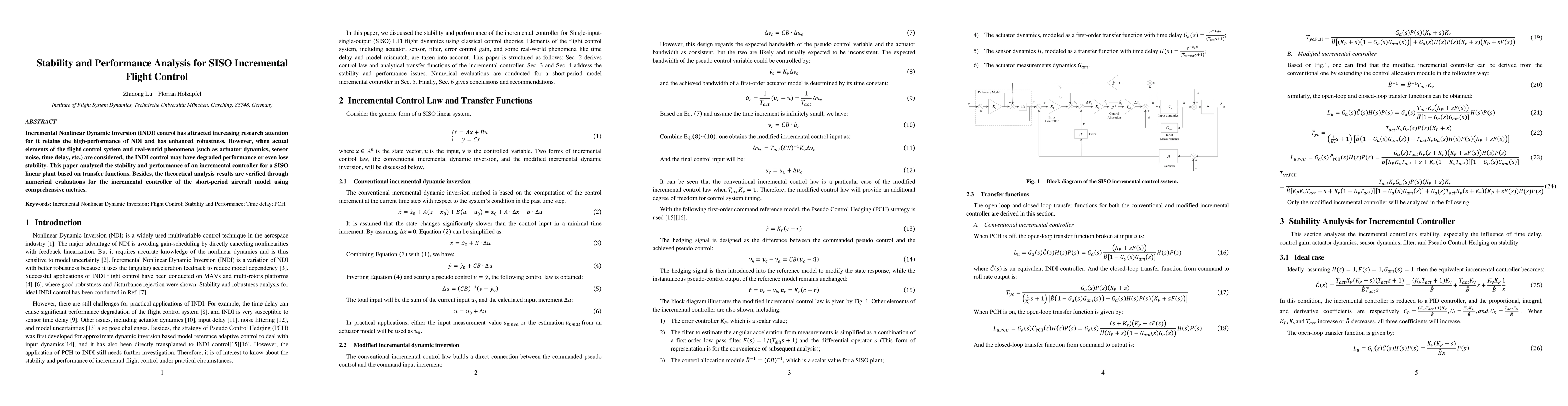 Incremental Nonlinear Dynamic Inversion (INDI) control has attracted increasing research attention for it retains the high-performance of NDI and has enhanced robustness. However, when actual elements of the flight control system and real-world phenomena (such as actuator dynamics, sensor noise, time delay, etc.) are considered, the INDI control may have degraded performance or even lose stability. This paper analyzed the stability and performance of an incremental controller for a SISO linear plant based on transfer functions. Besides, the theoretical analysis results are verified through numerical evaluations for the incremental controller of the short-period aircraft model using comprehensive metrics.