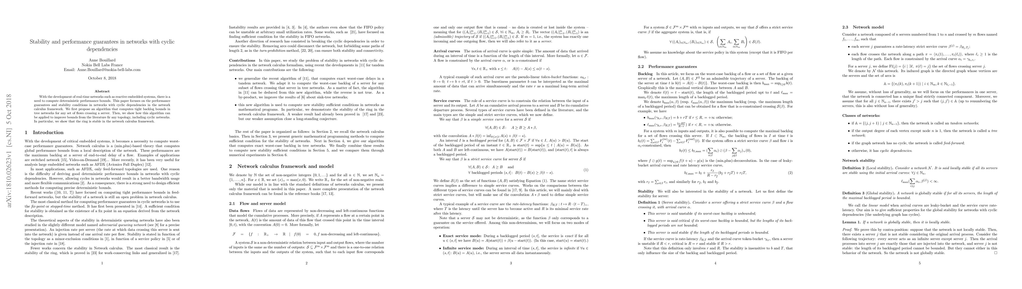 With the development of real-time networks such as reactive embedded systems, there is a need to compute deterministic performance bounds. This paper focuses on the performance guarantees and stability conditions in networks with cyclic dependencies in the network calculus framework. We first propose an algorithm that computes tight backlog bounds in tree networks for any set of flows crossing a server. Then, we show how this algorithm can be applied to improve bounds from the literature fir any topology, including cyclic networks. In particular, we show that the ring is stable in the network calculus framework.