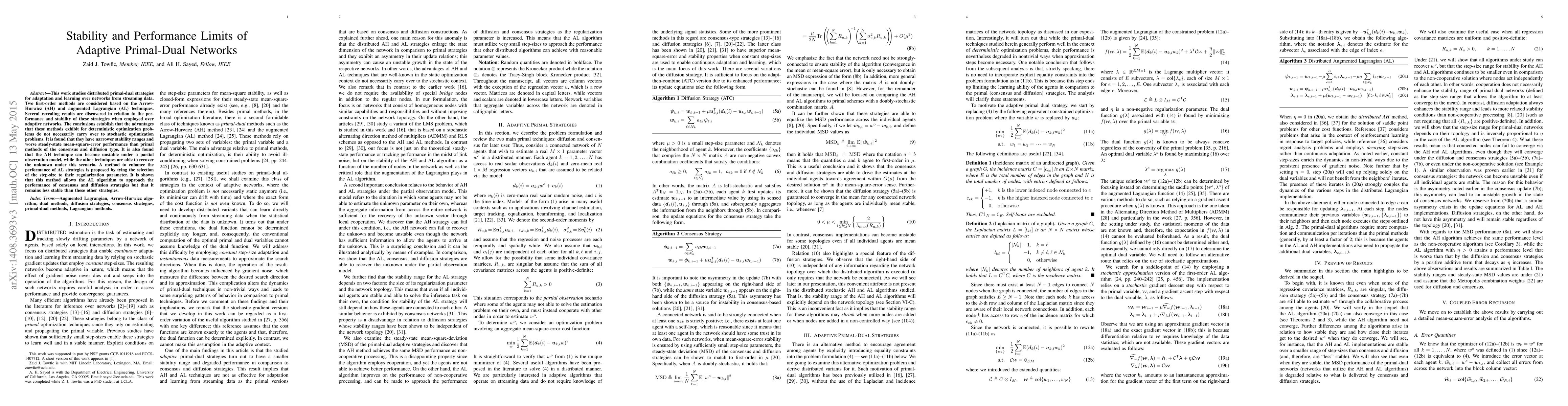 This work studies distributed primal-dual strategies for adaptation and learning over networks from streaming data. Two first-order methods are considered based on the Arrow-Hurwicz (AH) and augmented Lagrangian (AL) techniques. Several revealing results are discovered in relation to the performance and stability of these strategies when employed over adaptive networks. The conclusions establish that the advantages that these methods have for deterministic optimization problems do not necessarily carry over to stochastic optimization problems. It is found that they have narrower stability ranges and worse steady-state mean-square-error performance than primal methods of the consensus and diffusion type. It is also found that the AH technique can become unstable under a partial observation model, while the other techniques are able to recover the unknown under this scenario. A method to enhance the performance of AL strategies is proposed by tying the selection of the step-size to their regularization parameter. It is shown that this method allows the AL algorithm to approach the performance of consensus and diffusion strategies but that it remains less stable than these other strategies.