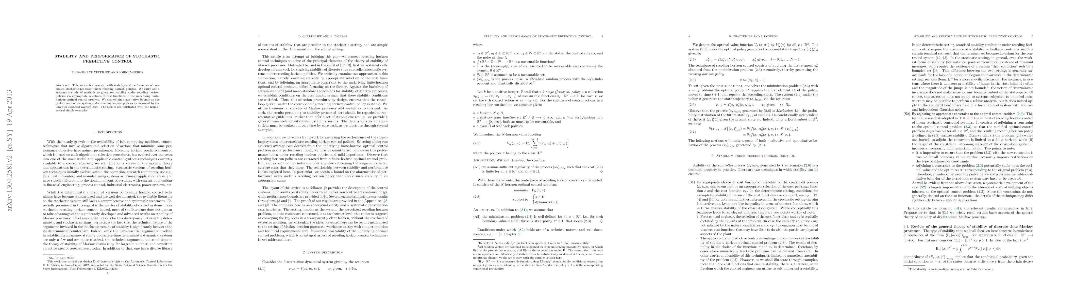 This paper investigates stability and performance of stochastic predictive control under receding horizon policies, providing methods to ensure stability through optimal cost function selection and deriving performance bounds based on long-run expected average cost, illustrated with simple examples.