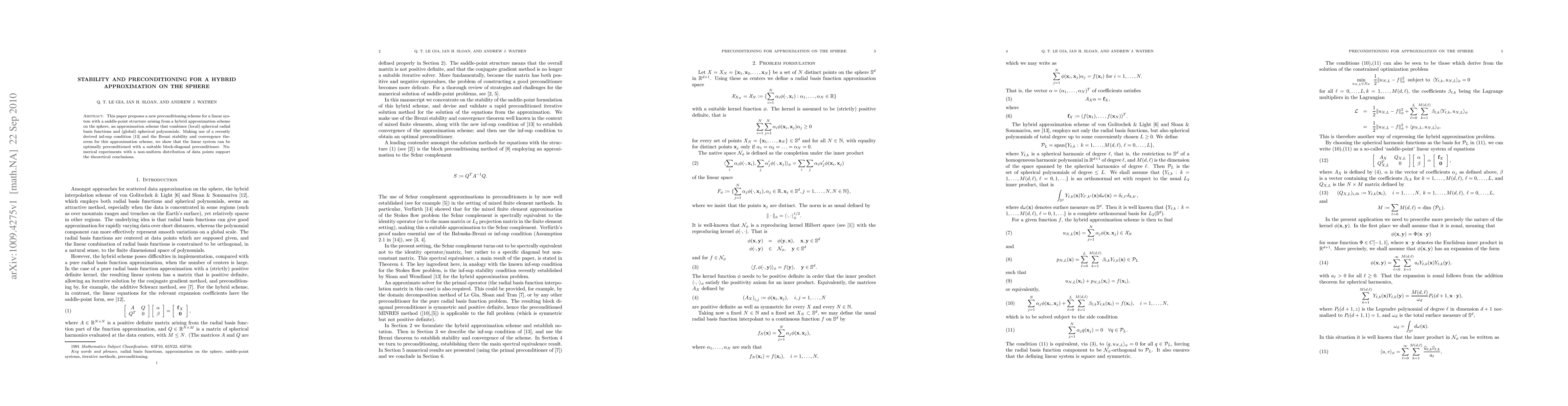 This paper presents a novel preconditioning method for a linear system with a saddle-point structure, originating from a hybrid approximation on the sphere. The method leverages an existing stability condition and proves optimal preconditioning with a block-diagonal preconditioner, supported by numerical experiments with non-uniform data points.