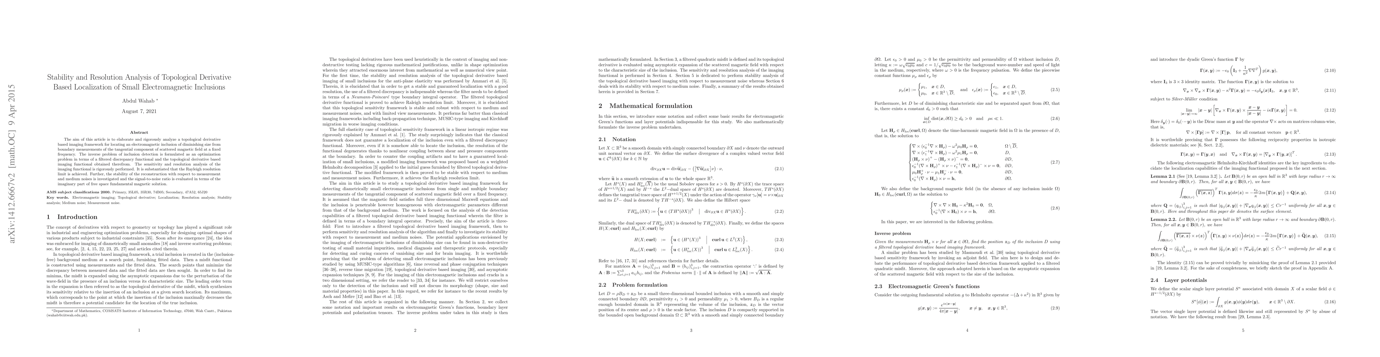 The aim of this article is to elaborate and rigorously analyze a topological derivative based imaging framework for locating an electromagnetic inclusion of diminishing size from boundary measurements of the tangential component of scattered magnetic field at a fixed frequency. The inverse problem of inclusion detection is formulated as an optimization problem in terms of a filtered discrepancy functional and the topological derivative based imaging functional obtained therefrom. The sensitivity and resolution analysis of the imaging functional is rigorously performed. It is substantiated that the Rayleigh resolution limit is achieved. Further, the stability of the reconstruction with respect to measurement and medium noises is investigated and the signal-to-noise ratio is evaluated in terms of the imaginary part of free space fundamental magnetic solution.