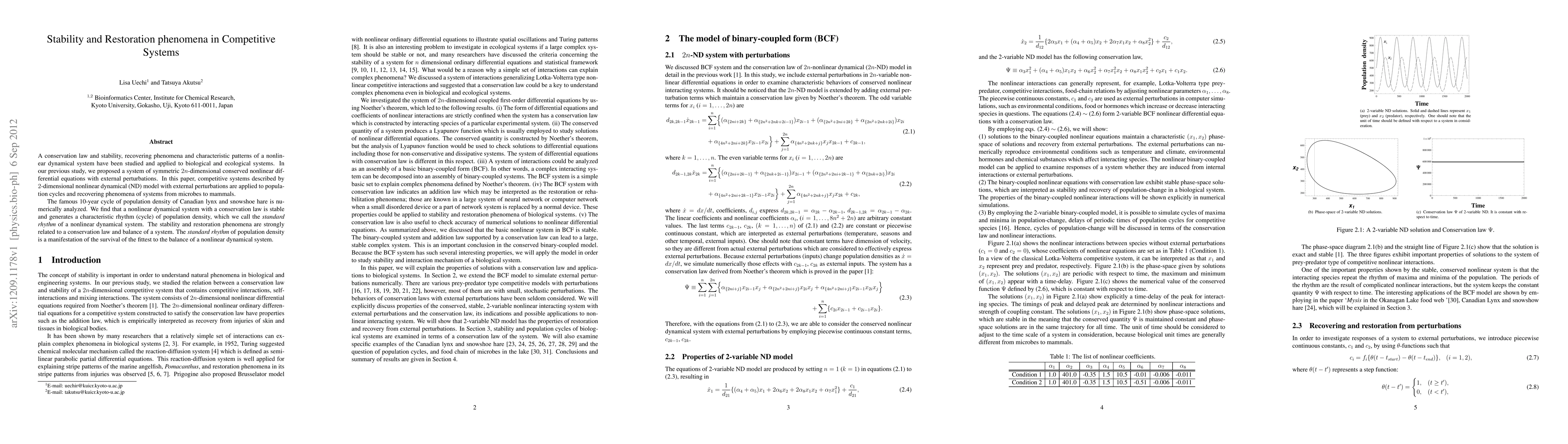 A conservation law and stability, recovering phenomena and characteristic patterns of a nonlinear dynamical system have been studied and applied to biological and ecological systems. In our previous study, we proposed a system of symmetric 2n-dimensional conserved nonlinear differential equations with external perturbations. In this paper, competitive systems described by 2-dimensional nonlinear dynamical (ND) model with external perturbations are applied to population cycles and recovering phenomena of systems from microbes to mammals. The famous 10-year cycle of population density of Canadian lynx and snowshoe hare is numerically analyzed. We find that a nonlinear dynamical system with a conservation law is stable and generates a characteristic rhythm (cycle) of population density, which we call the {\it standard rhythm} of a nonlinear dynamical system. The stability and restoration phenomena are strongly related to a conservation law and balance of a system. The {\it standard rhythm} of population density is a manifestation of the survival of the fittest to the balance of a nonlinear dynamical system.