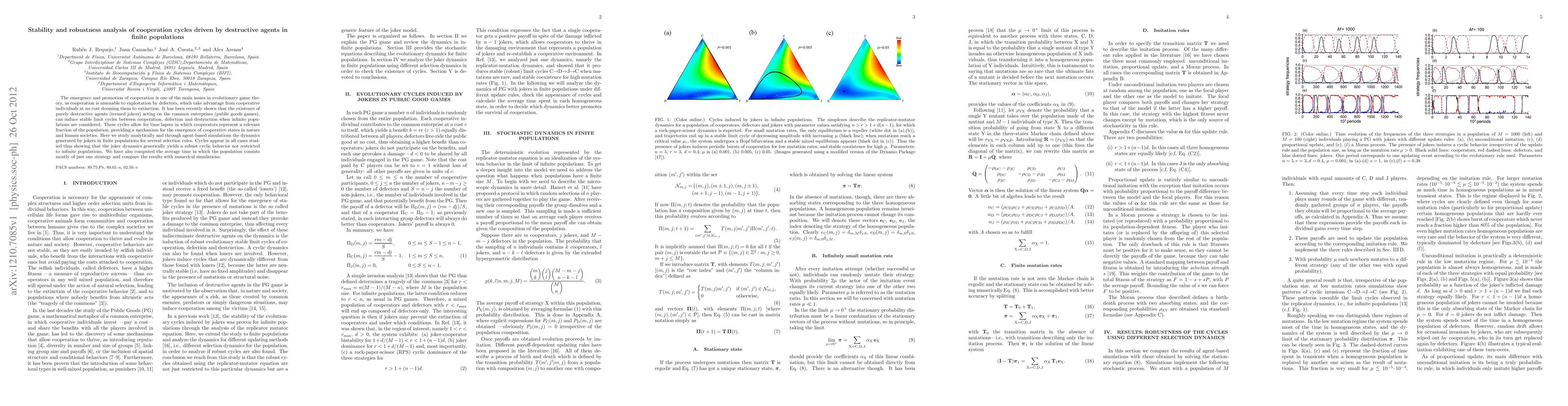 This paper explores the dynamics of cooperation cycles driven by destructive agents (jokers) in finite populations, demonstrating through analytical and simulation methods that these cycles are stable and robust, providing a mechanism for the emergence of cooperative states even in limited populations. The study also evaluates the average time of dominance by a single strategy, comparing analytical results with numerical simulations.