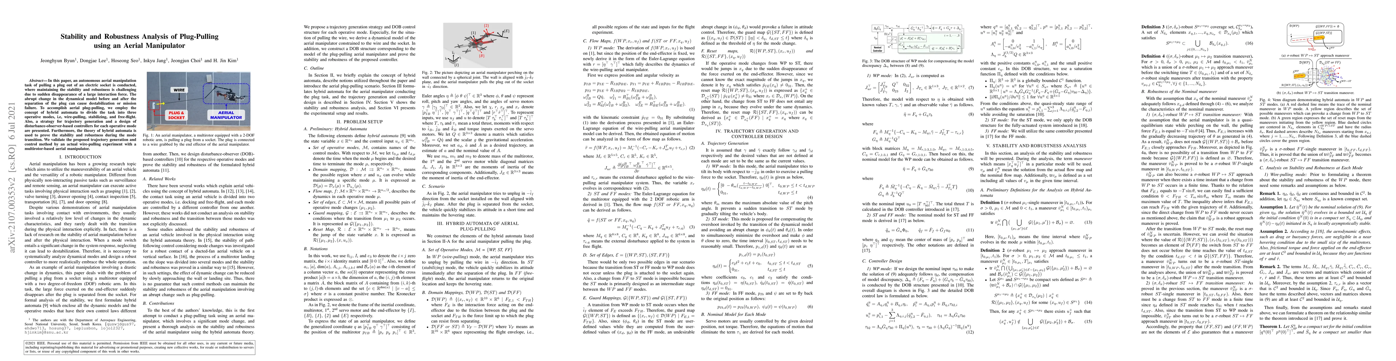 Researchers developed a method to stabilize and robustly control an aerial manipulator while pulling a plug out of an electric socket using hybrid automata and disturbance-observer-based controllers. The approach successfully validated through an actual experiment with a multirotor-based aerial manipulator.