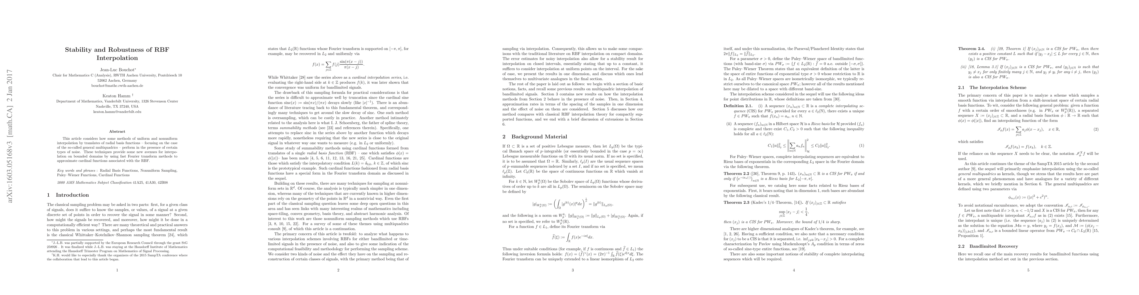 This paper investigates the stability and robustness of general multiquadric radial basis function (RBF) interpolation methods under noise conditions, employing fast Fourier transform techniques to enhance the approximation of cardinal functions, offering novel approaches for interpolation on bounded domains.