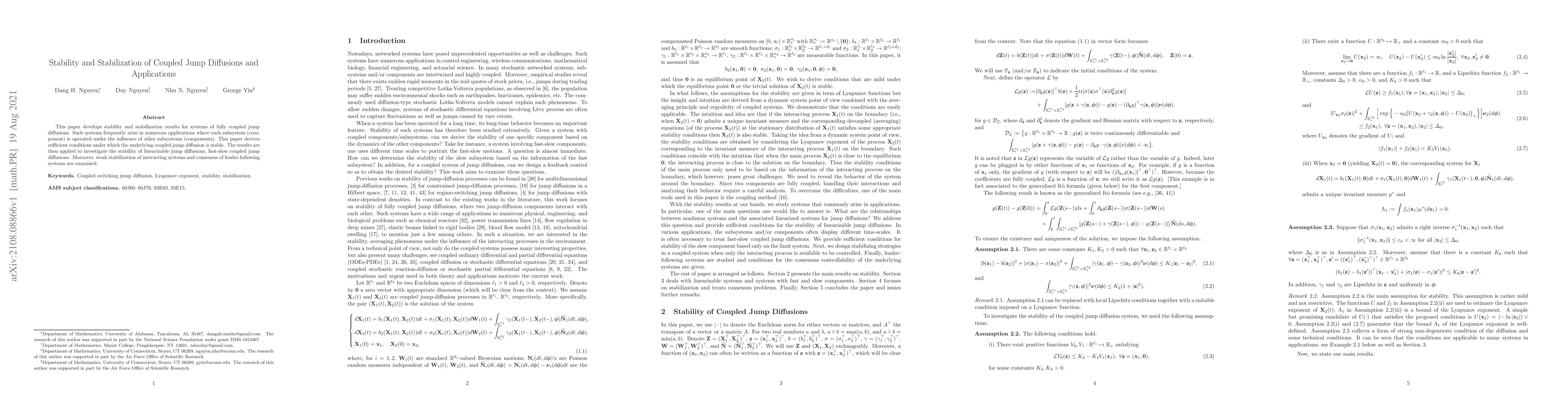 This paper establishes stability conditions for fully coupled jump diffusions and explores their applications, including stability of linearizable jump diffusions and consensus in leader-following systems, with a focus on weak stabilization techniques.