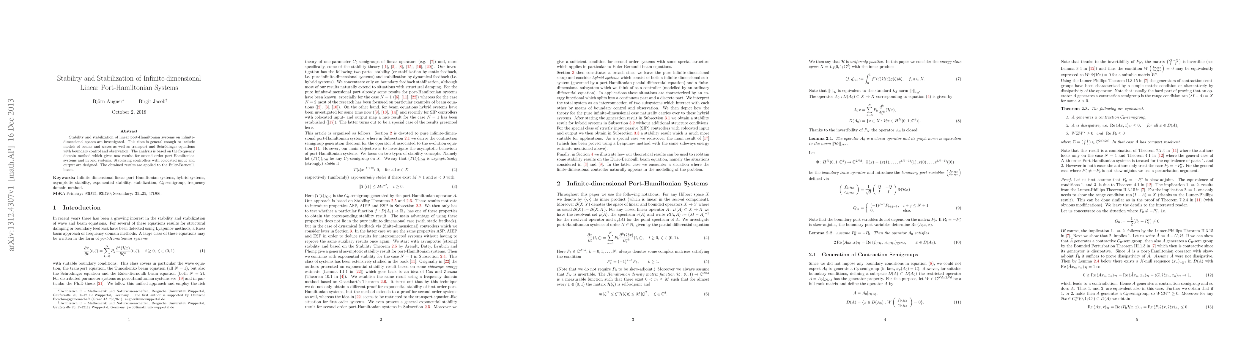 This paper investigates stability and stabilization techniques for infinite-dimensional linear port-Hamiltonian systems, including models for beams and waves. It employs a frequency domain method to design stabilizing controllers and applies these results to the Euler-Bernoulli beam.