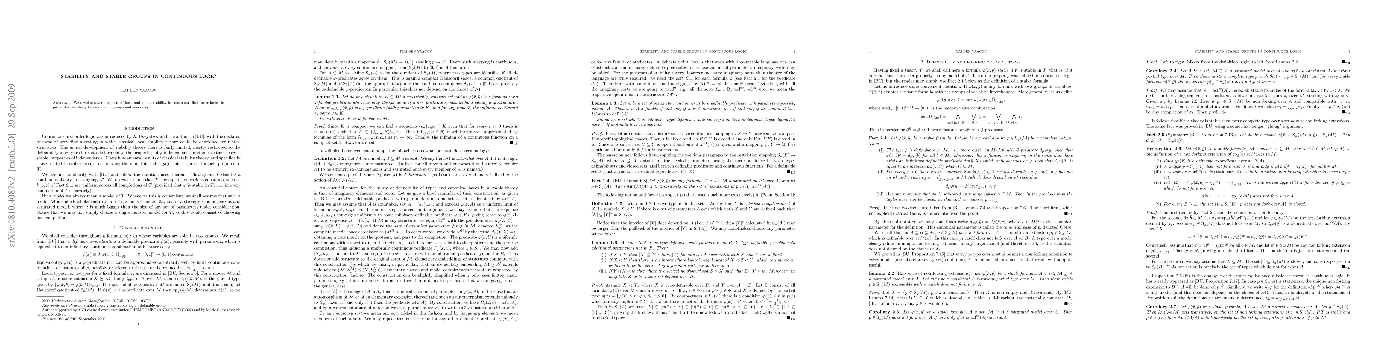 We develop several aspects of local and global stability in continuous first order logic. In particular, we study type-definable groups and genericity.