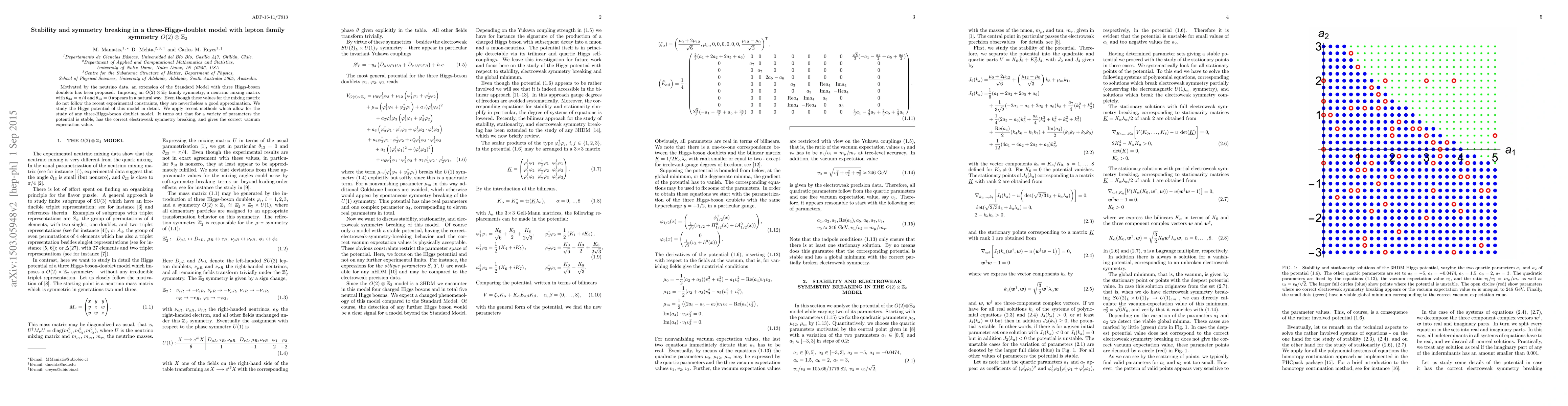 This paper explores a three Higgs-boson doublet model with O(2) x Z2 family symmetry motivated by neutrino data, predicting a specific neutrino mixing matrix. The study finds the Higgs potential stable and capable of achieving the correct electroweak symmetry breaking and vacuum expectation value for a range of parameters.