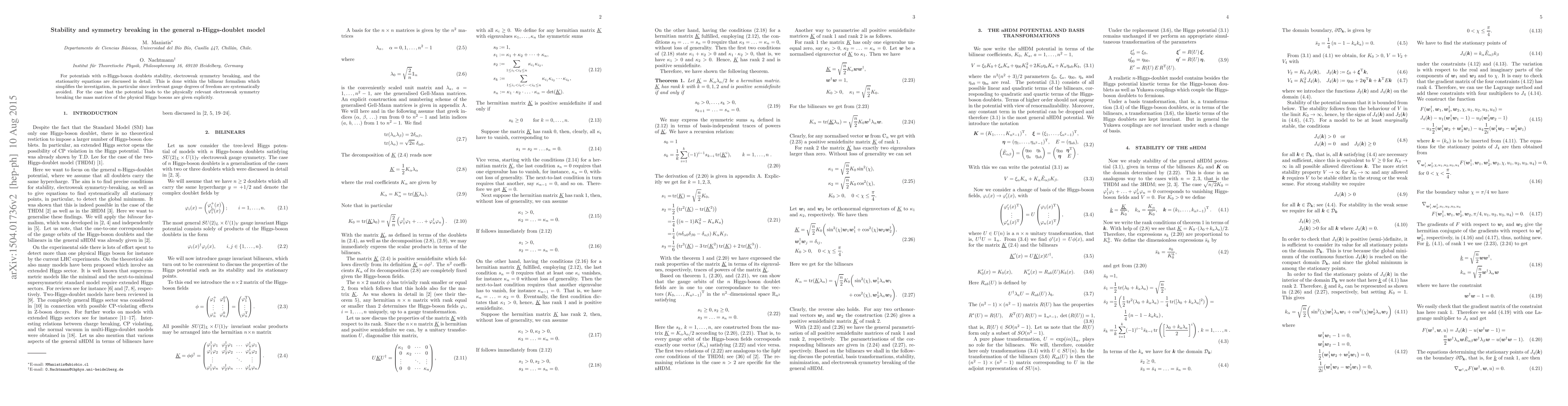 This paper investigates the stability and electroweak symmetry breaking in the general n-Higgs-doublet model using the bilinear formalism, providing explicit mass matrices for the physical Higgs bosons when symmetry breaking occurs. The approach systematically avoids irrelevant gauge degrees of freedom.