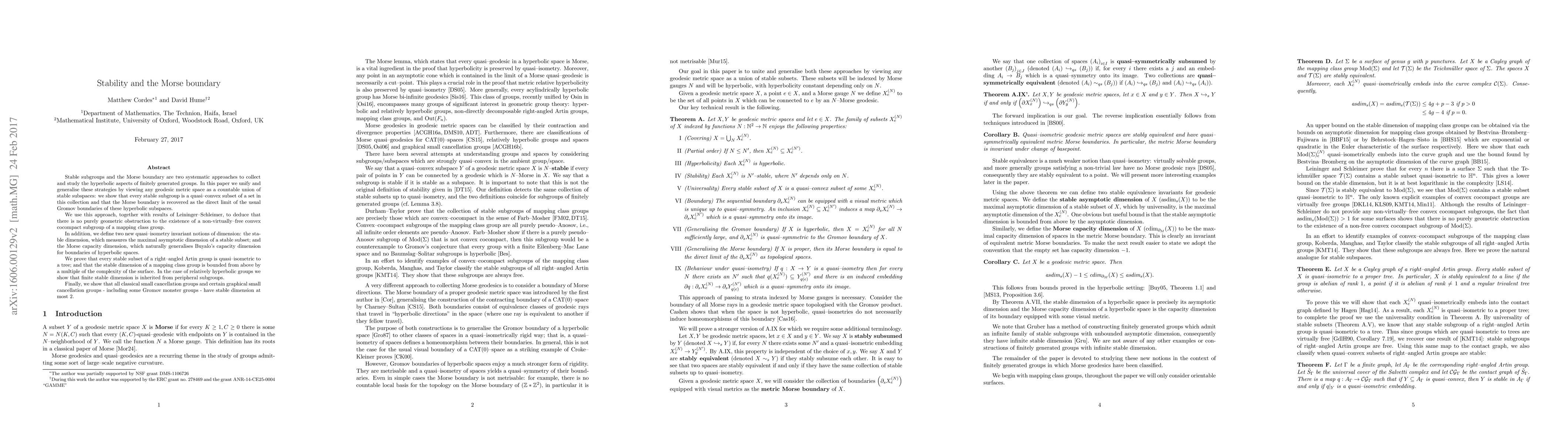 Stable subgroups and the Morse boundary are two systematic approaches to collect and study the hyperbolic aspects of finitely generated groups. In this paper we unify and generalize these strategies by viewing any geodesic metric space as a countable union of stable subspaces: we show that every stable subgroup is a quasi--convex subset of a set in this collection and that the Morse boundary is recovered as the direct limit of the usual Gromov boundaries of these hyperbolic subspaces. We use this approach, together with results of Leininger--Schleimer, to deduce that there is no purely geometric obstruction to the existence of a non-virtually--free convex cocompact subgroup of a mapping class group. In addition, we define two new quasi--isometry invariant notions of dimension: the stable dimension, which measures the maximal asymptotic dimension of a stable subset; and the Morse capacity dimension, which naturally generalises Buyalo's capacity dimension for boundaries of hyperbolic spaces. We prove that every stable subset of a right--angled Artin group is quasi--isometric to a tree; and that the stable dimension of a mapping class group is bounded from above by a multiple of the complexity of the surface. In the case of relatively hyperbolic groups we show that finite stable dimension is inherited from peripheral subgroups. Finally, we show that all classical small cancellation groups and certain Gromov monster groups have stable dimension at most 2.