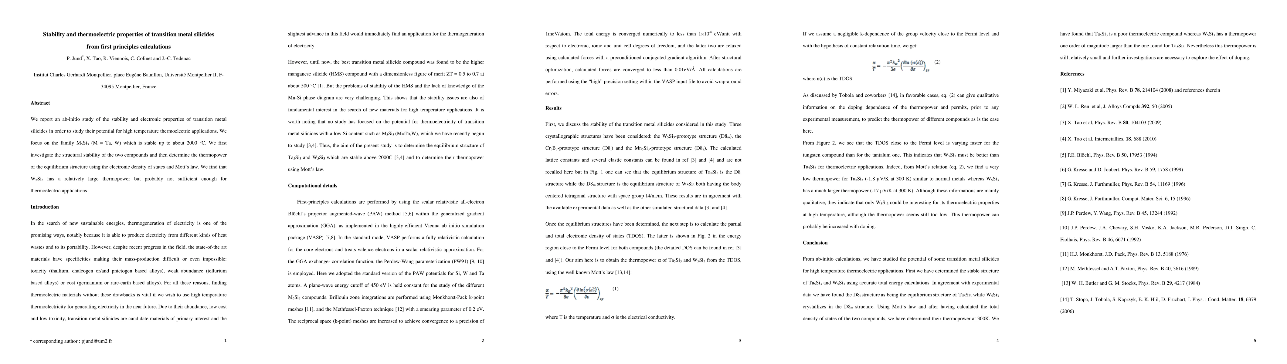 Summary: This study investigates the stability and thermoelectric properties of Ta5Si3 and W5Si3 using first principles calculations. W5Si3 shows a large thermopower but may not be sufficient for high-temperature thermoelectric applications.