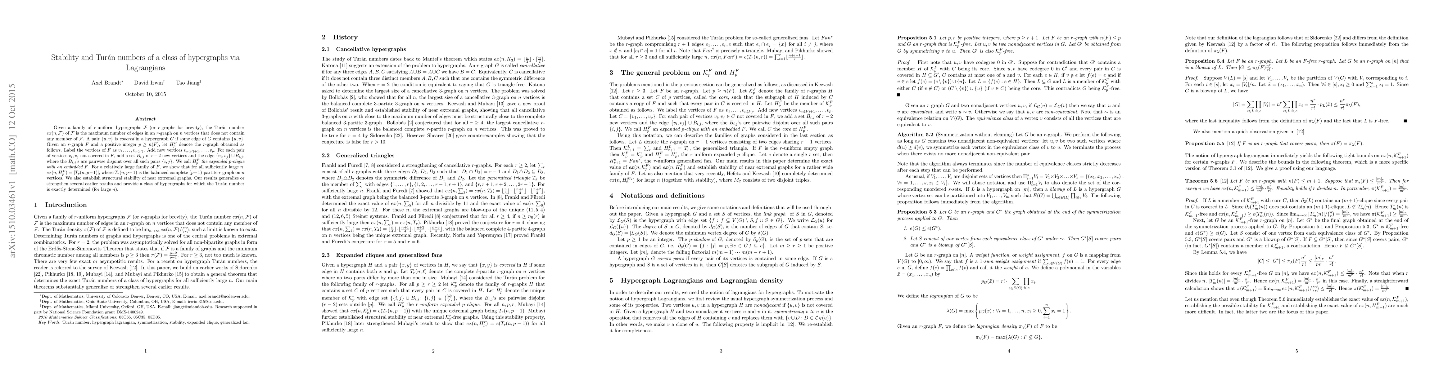Given a family of $r$-uniform hypergraphs ${\cal F}$ (or $r$-graphs for brevity), the Tur\'an number $ex(n,{\cal F})$ of ${\cal F}$ is the maximum number of edges in an $r$-graph on $n$ vertices that does not contain any member of ${\cal F}$. A pair $\{u,v\}$ is covered in a hypergraph $G$ if some edge of $G$ contains $\{u,v\}$. Given an $r$-graph $F$ and a positive integer $p\geq n(F)$, let $H^F_p$ denote the $r$-graph obtained as follows. Label the vertices of $F$ as $v_1,\ldots, v_{n(F)}$. Add new vertices $v_{n(F)+1},\ldots, v_p$. For each pair of vertices $v_i,v_j$ not covered in $F$, add a set $B_{i,j}$ of $r-2$ new vertices and the edge $\{v_i,v_j\}\cup B_{i,j}$, where the $B_{i,j}$'s are pairwise disjoint over all such pairs $\{i,j\}$. We call $H^F_p$ the expanded $p$-clique with an embedded $F$. For a relatively large family of $F$, we show that for all sufficiently large $n$, $ex(n,H^F_p)=|T_r(n,p-1)|$, where $T_r(n,p-1)$ is the balanced complete $(p-1)$-partite $r$-graph on $n$ vertices. We also establish structural stability of near extremal graphs. Our results generalize or strengthen several earlier results and provide a class of hypergraphs for which the Tur\'an number is exactly determined (for large $n$).