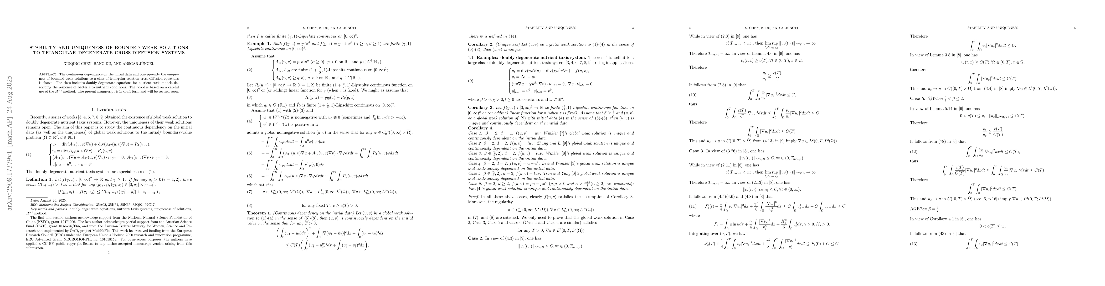 The continuous dependence on the initial data and consequently the uniqueness of bounded weak solutions to a class of triangular reaction-cross-diffusion equations is shown. The class includes doubly degenerate equations for nutrient taxis models describing the response of bacteria to nutrient conditions. The proof is based on a careful use of the $H^{-1}$ method. The present manuscript is in draft form and will be revised soon.