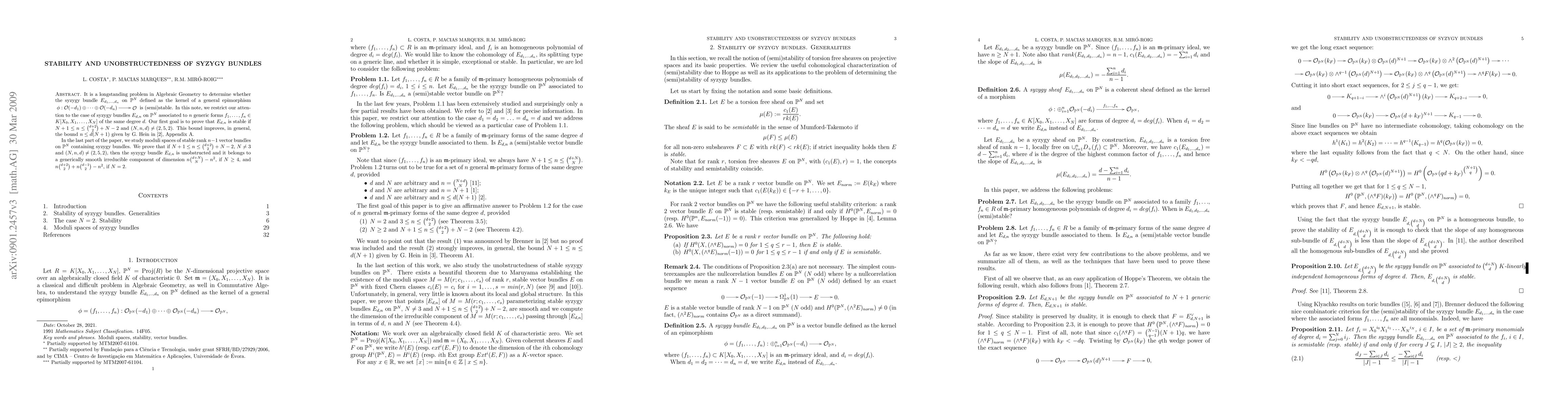 This paper investigates the stability and unobstructedness of syzygy bundles on projective spaces. It proves that syzygy bundles $E_{d,n}$ are stable under certain conditions, improving existing bounds. Additionally, it shows that under these conditions, $E_{d,n}$ is unobstructed and resides in a smooth irreducible component of the moduli space of vector bundles.
