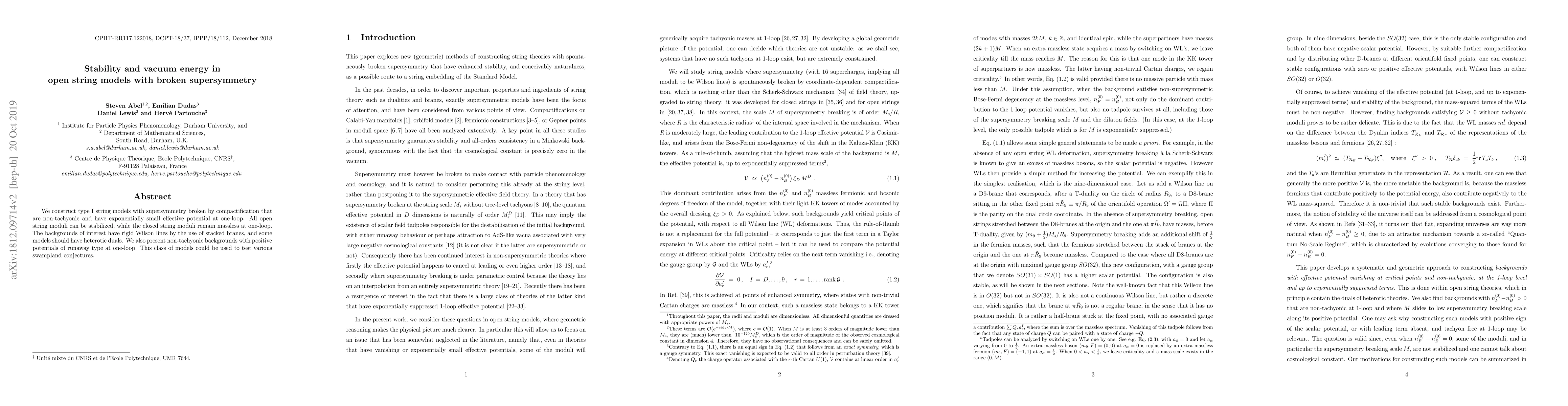 This paper constructs stable type I string models with broken supersymmetry and exponentially small vacuum energy, stabilizing all open string moduli while leaving closed string moduli massless. These models, featuring rigid Wilson lines and potential heterotic duals, could serve to test swampland conjectures.