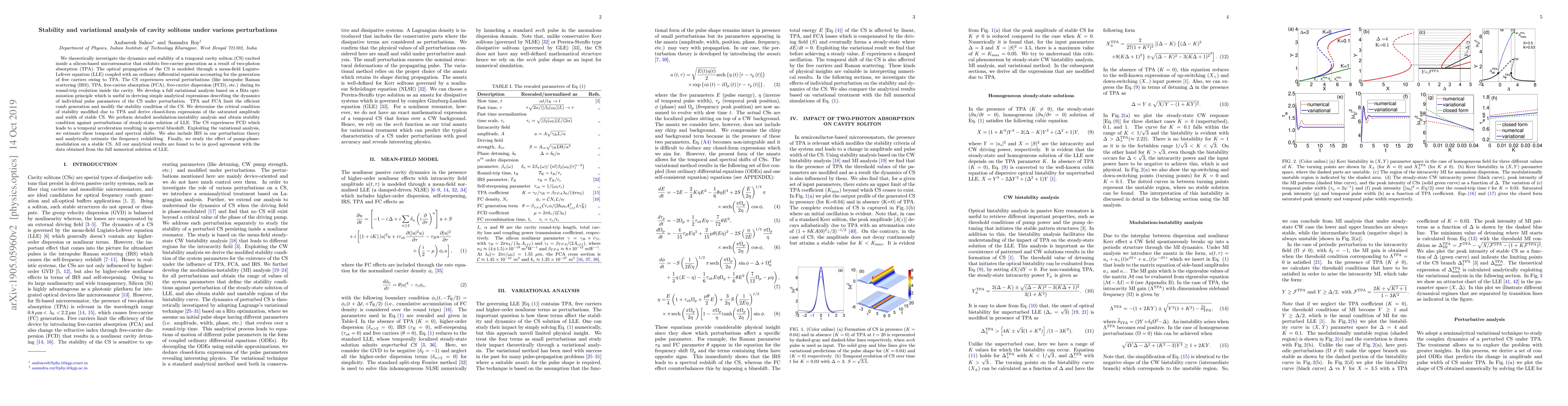 We theoretically investigate the dynamics and stability of a temporal cavity soliton (CS) excited inside a silicon-based microresonator that exhibits free-carrier generation as a result of two-photon absorption (TPA). The optical propagation of the CS is modeled through a mean-field Lugiato-Lefever equation (LLE) coupled with an ordinary differential equation accounting for the generation of free carriers owing to TPA. The CS experiences several perturbations (like intrapulse Raman scattering (IRS), TPA, free-carrier absorption (FCA), free-carrier dispersion (FCD), etc.) during its round-trip evolution inside the cavity. We develop a full variational analysis based on a Ritz optimization principle which is useful in deriving simple analytical expressions describing the dynamics of individual pulse parameters of the CS under perturbation. TPA and FCA limit the efficient comb generation and modify the stability condition of the CS. We determine the critical condition of stability modified due to TPA and derive closed-form expressions of the saturated amplitude and width of stable CS. We perform detailed modulation-instability analysis and obtain stability condition against perturbations of steady-state solution of LLE. The CS experiences FCD which leads to a temporal acceleration resulting in spectral blueshift. Exploiting the variational analysis, we estimate these temporal and spectral shifts. We also include IRS in our perturbation theory and analytically estimate the frequency redshifting. Finally, we study the effect of pump-phase-modulation on a stable CS. All our analytical results are found to be in good agreement with the data obtained from the full numerical solution of LLE.